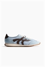 Кроссовки со шнуровкой и язычком спереди. Сетчатые стельки и подошва с узором.