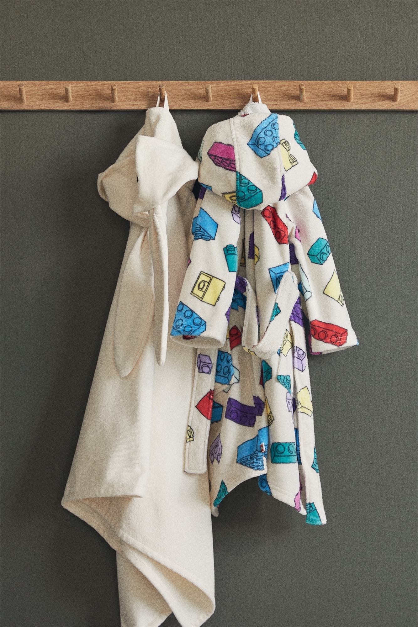 Халат с капюшоном из мягкой хлопковой махры с большими накладными карманами спереди и поясом-завязкой на талии.