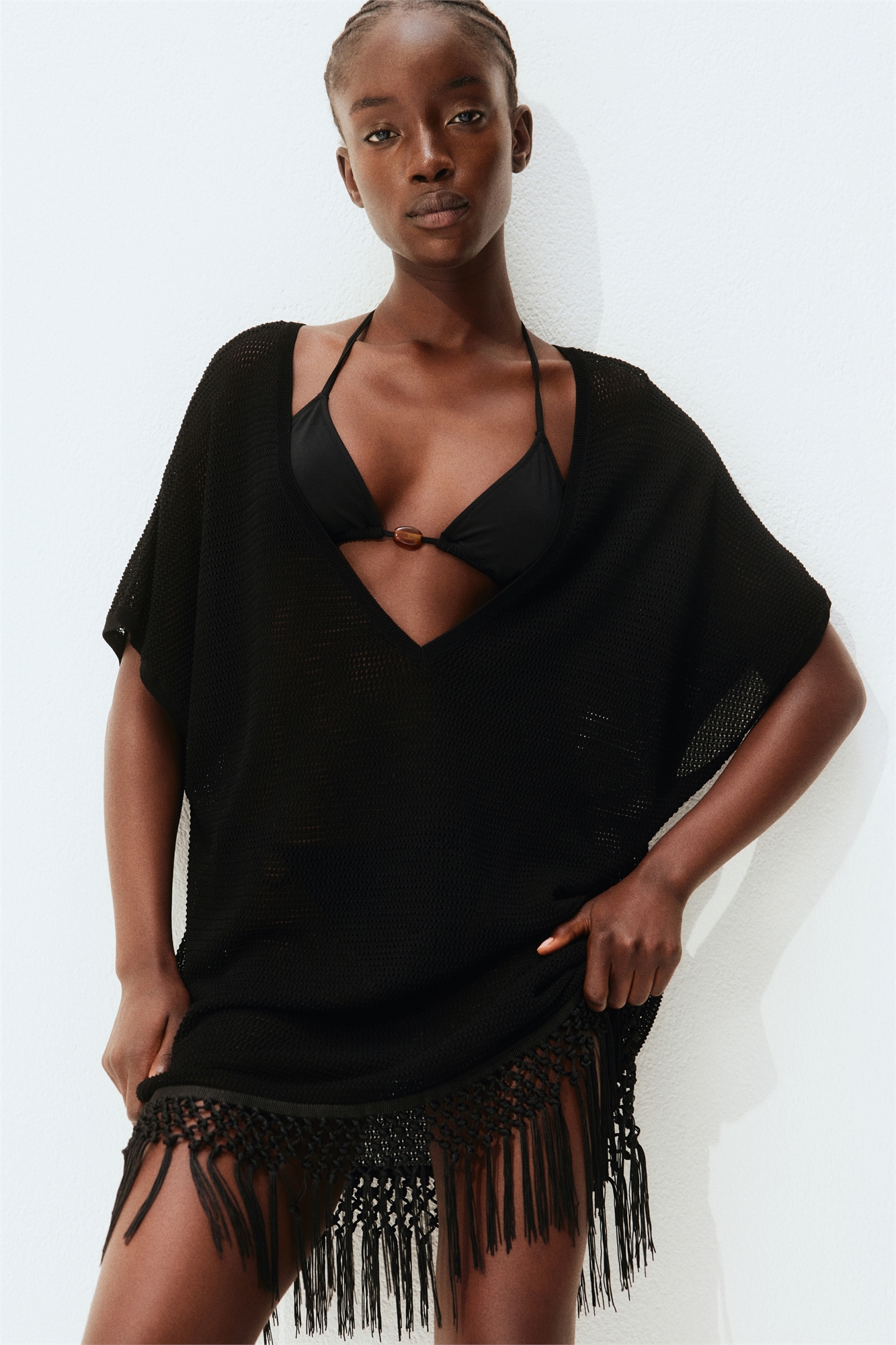 Короткий пляжный кафтан свободного покроя из воздушного трикотажа с глубоким V-образным вырезом, короткими рукавами и подолом, отделанным бахромой.
