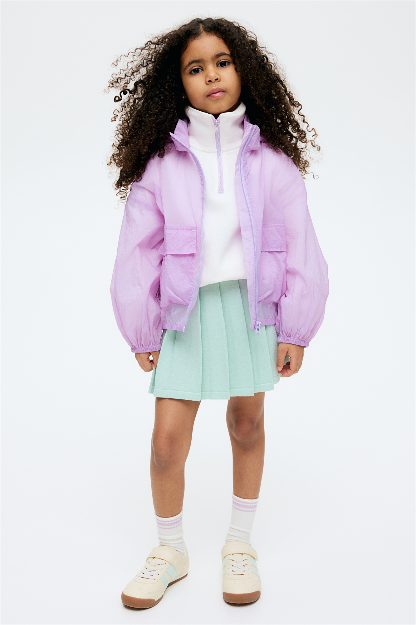 Ветровка из мятого нейлона с отстегивающимся капюшоном. Воротник-стойка, застежка-молния спереди, защита подбородка от натирания и спущенные плечи. Накладные передние карманы с потайной застежкой на крючок и петлю. Узкие эластичные манжеты и подол. Без подкладки.
