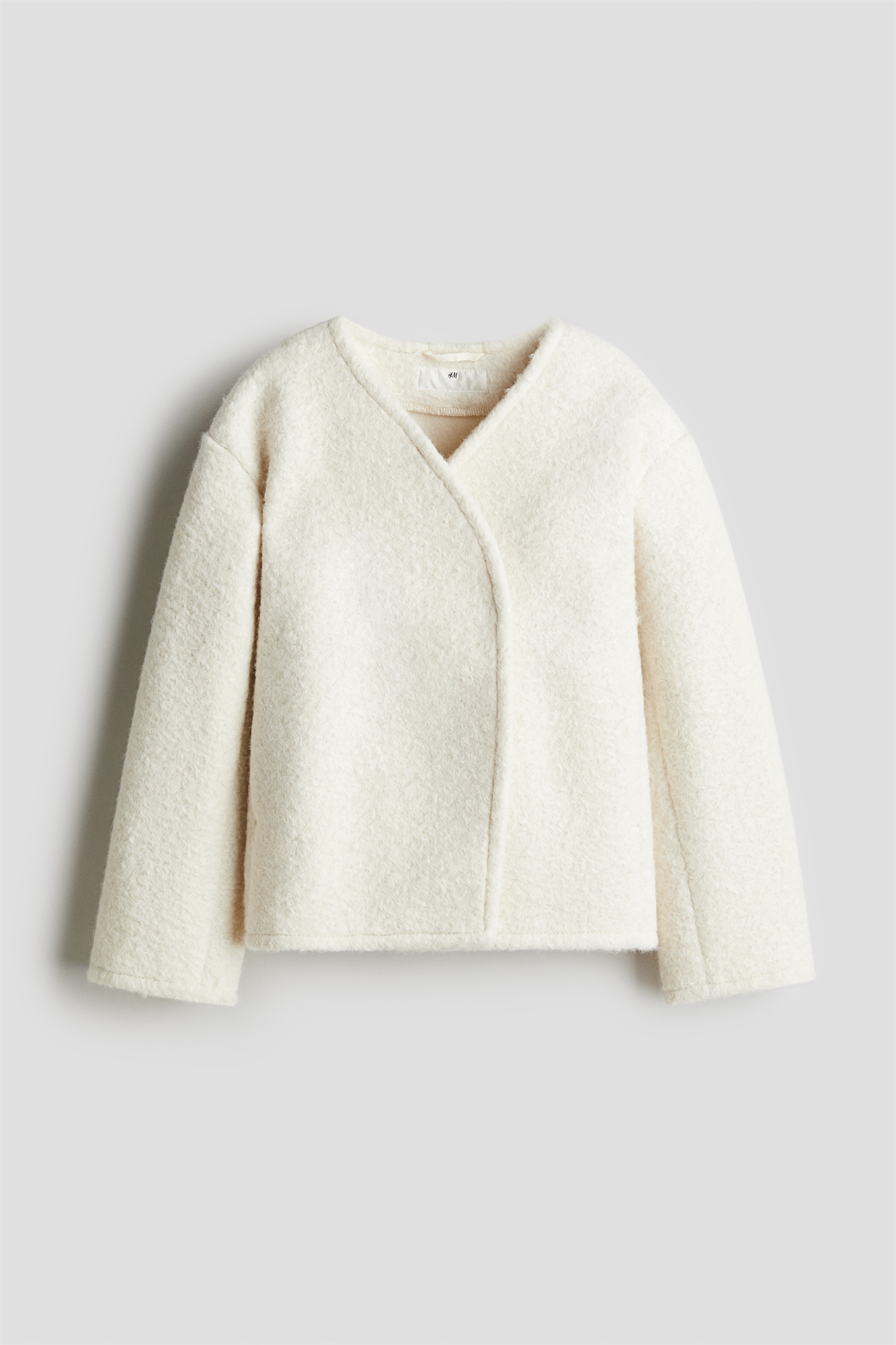 Блейзер без воротника из мягкого тканого материала. Блейзер с опущенными плечами и двумя скрытыми застежками спереди. На подкладке.