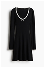 Короткое приталенное платье из тонкого трикотажа в рубчик с глубоким круглым вырезом и длинными рукавами. Вырез и манжеты отделаны гребешками контрастного цвета, а также декоративным бантом по центру бюста.