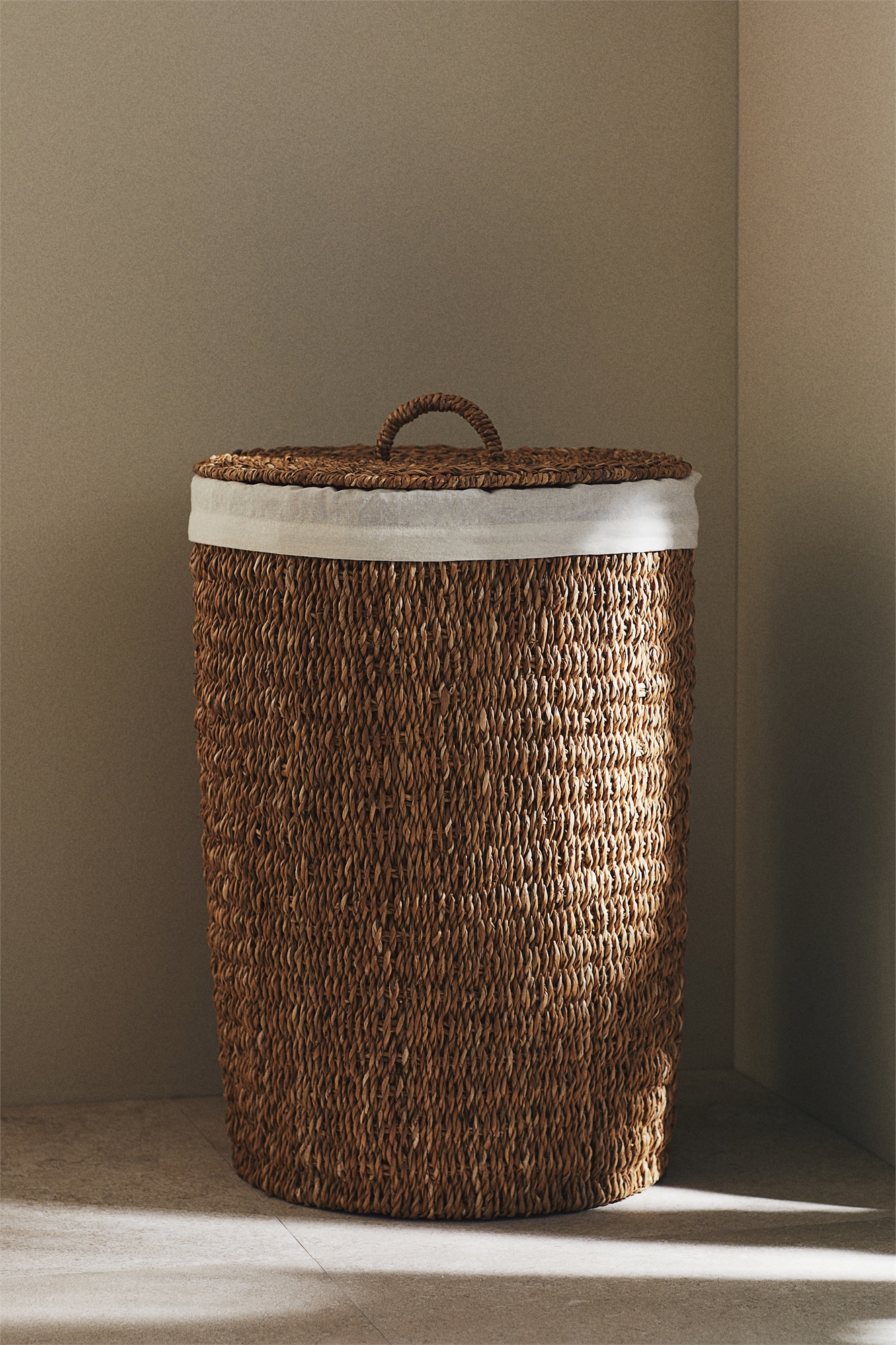 Очень большая корзина для белья из плетеного сиграсса с крышкой. Сумка из хлопкового плетения с завязкой сверху для легкого закрывания. Диаметр 45 см. Высота 64 см.
