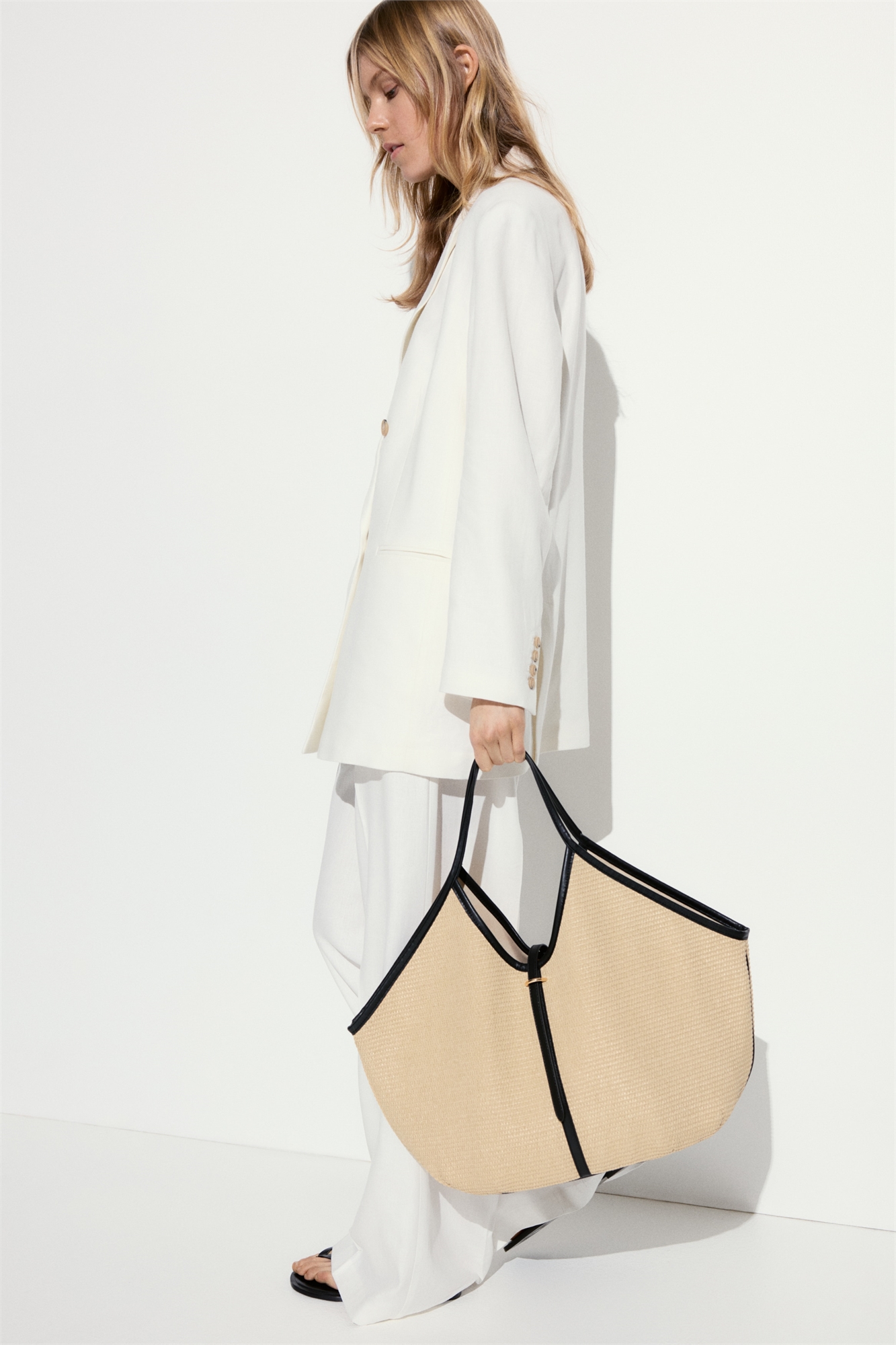 Сумка-шоппер из плетеной пластиковой соломы с деталями из ткани с покрытием. Узкие ручки, узкий ремешок сверху и внутренний карман на молнии. На подкладке.