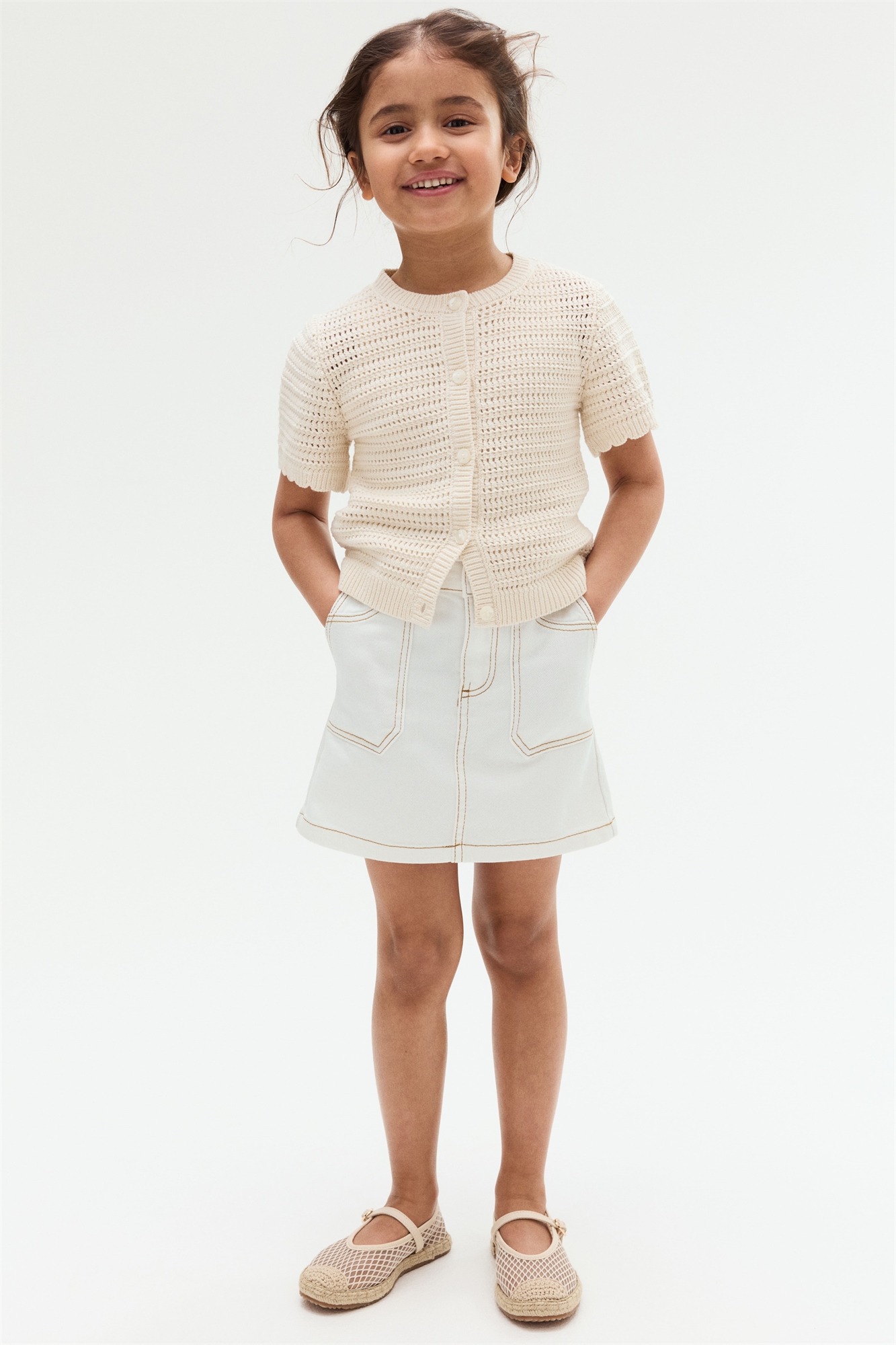 Юбка A-line из мягкой хлопковой саржи с регулируемой резинкой на талии, застежкой на молнию спереди с защитой от натирания и накладными карманами спереди.