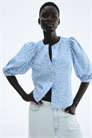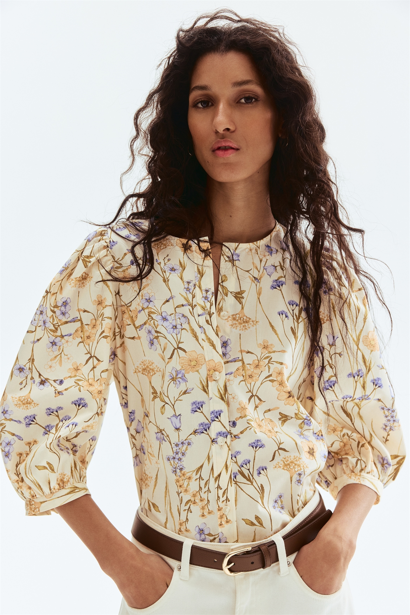 Приталенная блузка из хрустящего хлопкового поплина с круглым вырезом и пуговицами спереди. Рукава длиной до локтя с узкой окантовкой и пуговицей на манжетах. Аккуратный закругленный подол.