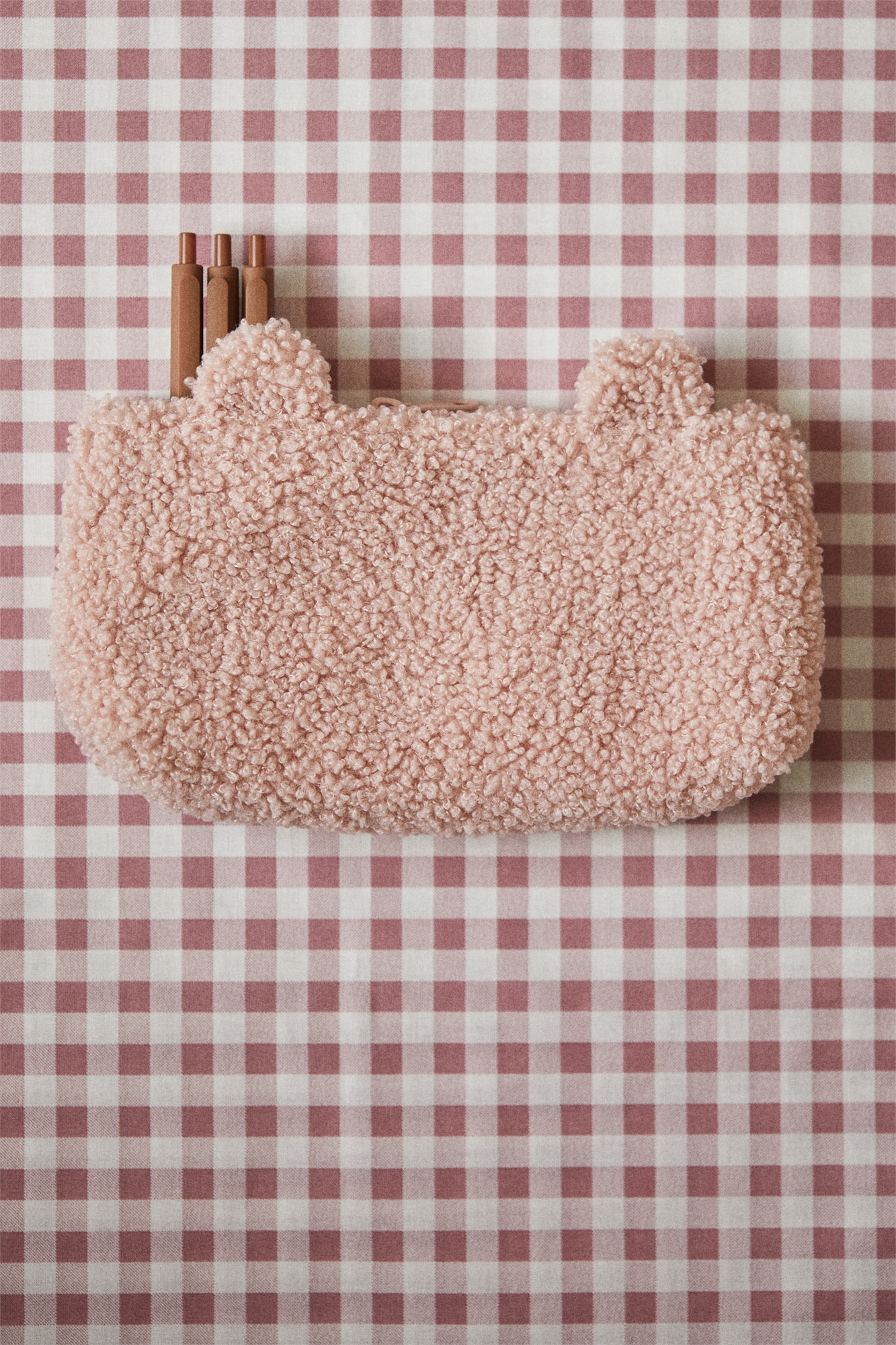 Пенал из мягкой, пушистой плюшевой ткани с милыми аппликациями на ушках и застежкой-молнией сверху. Очаровательное место для хранения ручек, ластиков и безделушек. На подкладке.