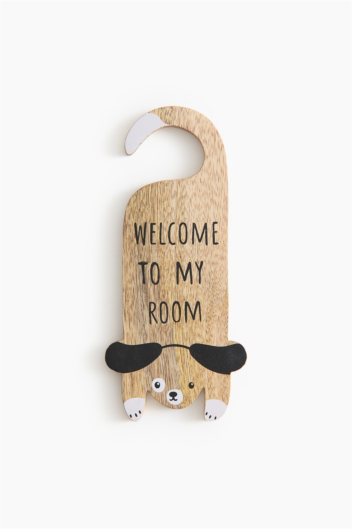 Дверной знак из дерева манго в форме дружелюбной собаки. На одной стороне написано "Добро пожаловать в мою комнату", приглашая поиграть, а на другой - "Не беспокоить", указывая на то, что ваш ребенок может делать домашнее задание или отдыхать.