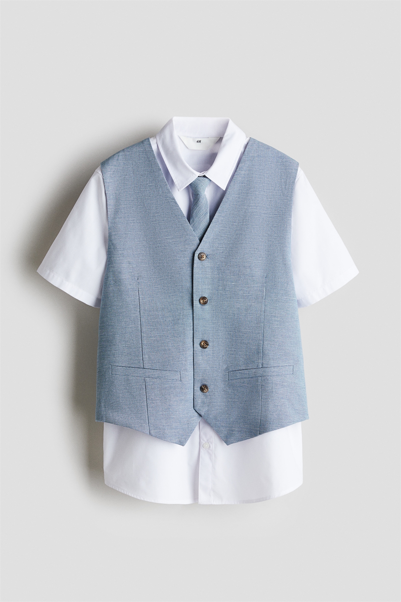 Нарядный комплект из рубашки из поплина, жилета и классического галстука мягкого переплетения из смеси льна и хлопка. Рубашка с короткими рукавами, воротником, передом и пуговицами. Жилет на подкладке с V-образным вырезом, пуговицами спереди и втачными карманами.