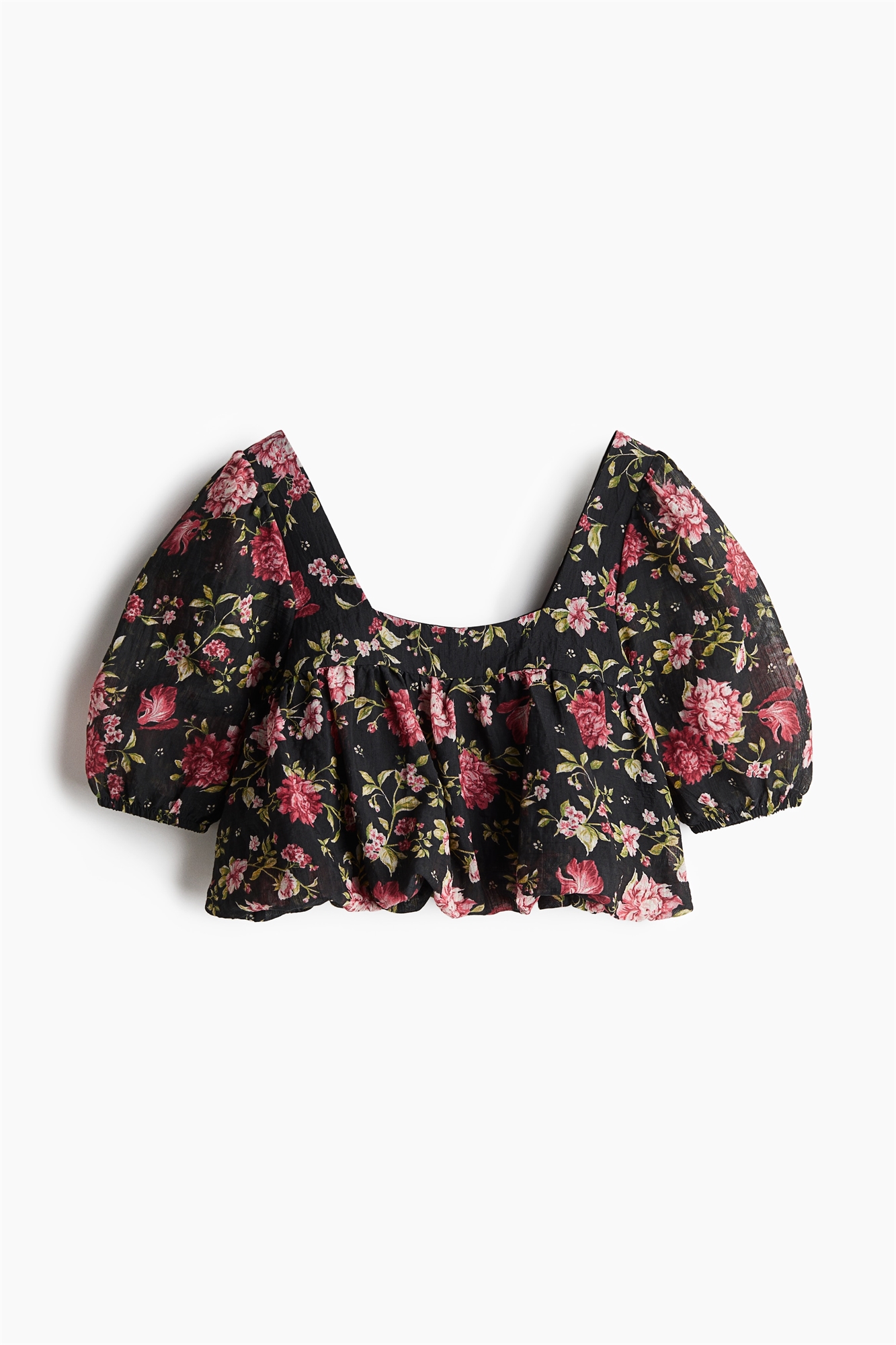 Облегающая блузка с узорчатым переплетением, квадратным вырезом и короткими пышными рукавами с узкими эластичными манжетами. Присборенный шов в верхней части и расклешенный пеплум с пузырчатым подолом для придания силуэту пышности. На подкладке.