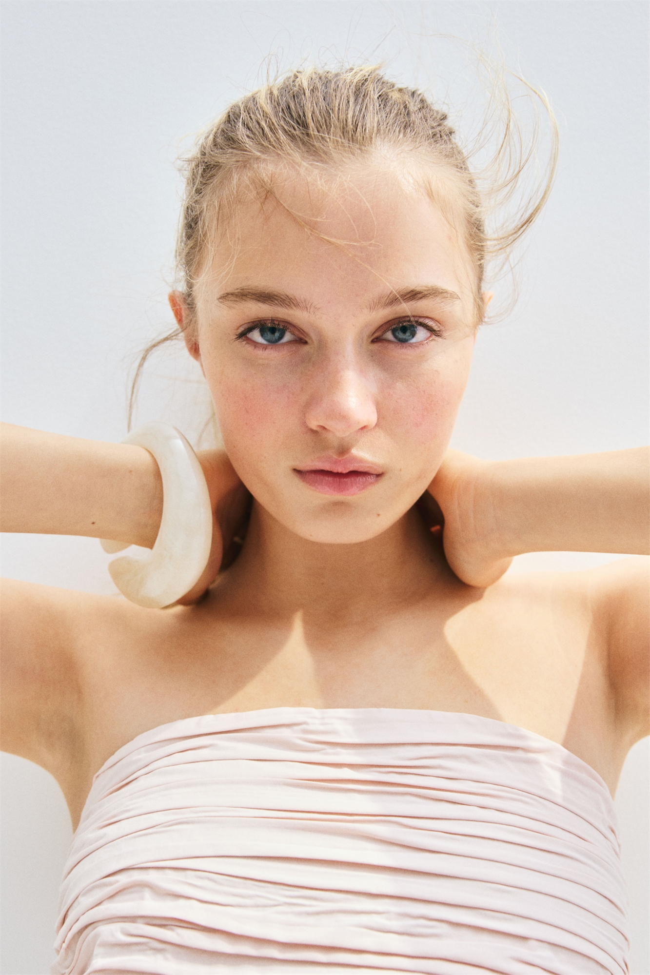 Топ-бандо из хлопкового полотна со скрытой силиконовой отделкой в верхней части, рюшами спереди и эластичным швом сзади. Присборенный шов на талии и подол в виде пузыря. На подкладке.