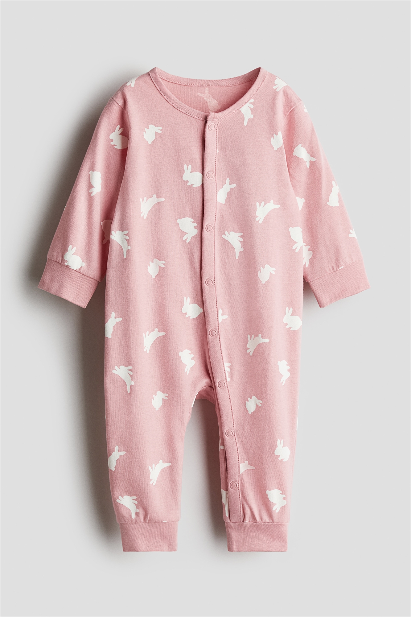 Спальный костюм из мягкого хлопкового джерси с принтом по всей поверхности. Длинные рукава с окантовкой на манжетах и длинные ножки с манжетами на подоле. Застежки на кнопках спереди и на одной штанине для удобства переодевания.