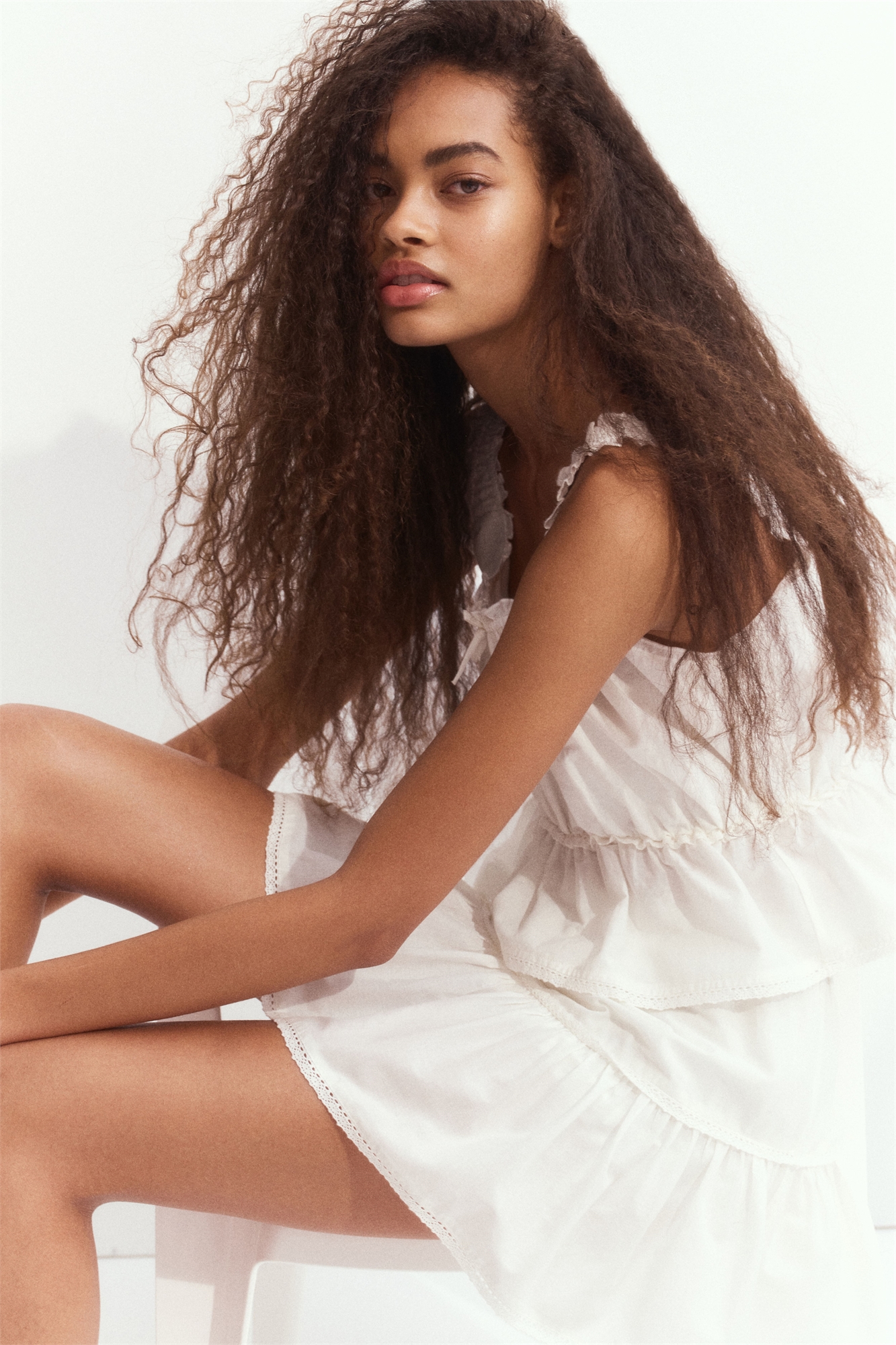 Мини-юбка из мягкого хлопкового полотна с кружевной отделкой. Эластичная резинка на талии и сборчатый шов над подолом. На хлопковой подкладке.