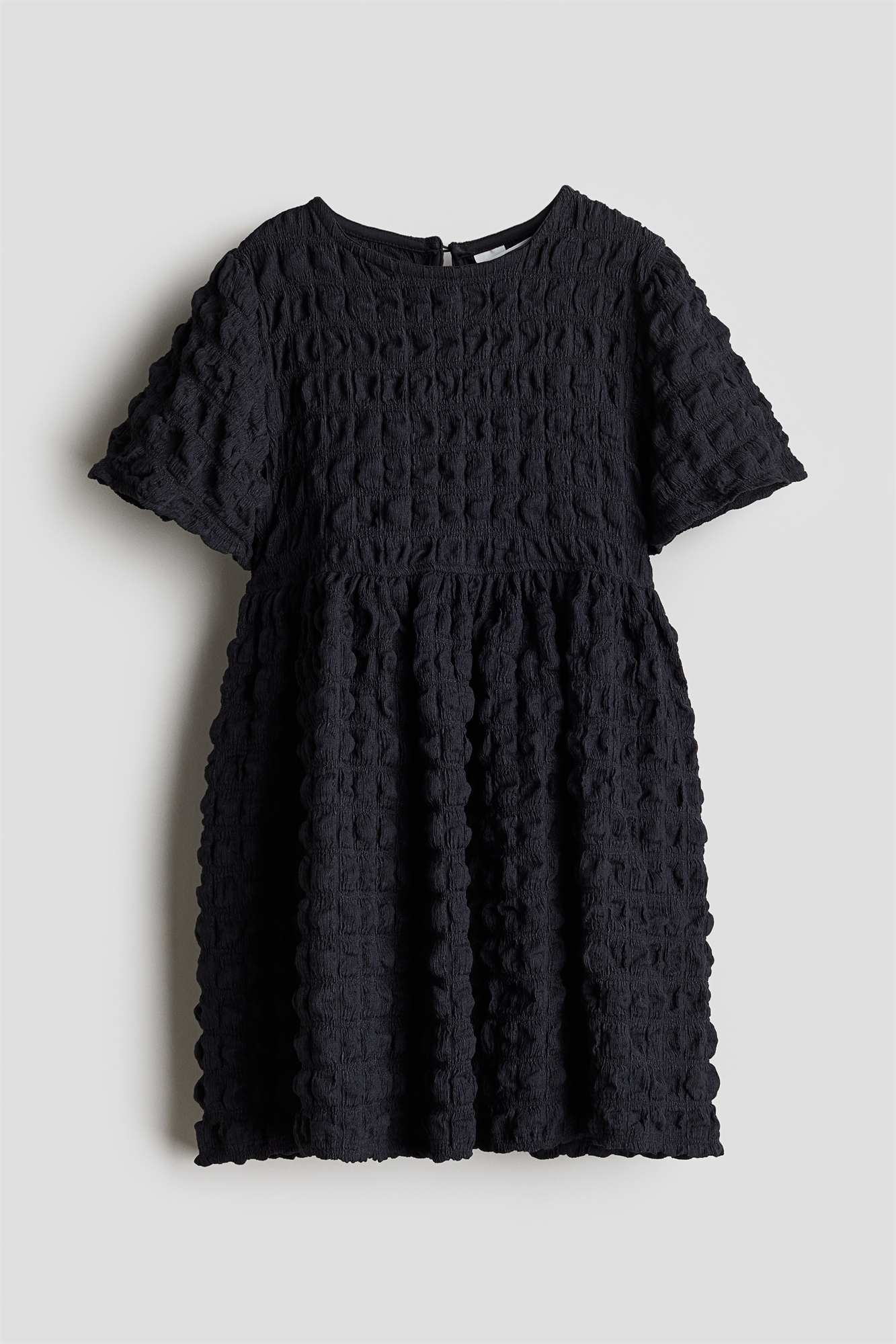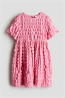 Платье из структурированного джерси с круглым вырезом, отверстием для ключа с пуговицей сзади, короткими рукавами и сборчатым швом на талии.