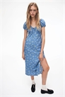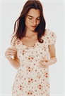 Длинное платье с воздушным переплетением из смеси вискозы и льна. Вырез в форме сердца с узкими завязками спереди, короткие пышные рукава и сборчатые формованные чашечки. Узкая эластичная резинка вокруг выреза, на плечах и на манжетах. Потайная застежка-молния с одной стороны и прямой подол с высоким разрезом с одной стороны. Без подкладки.
