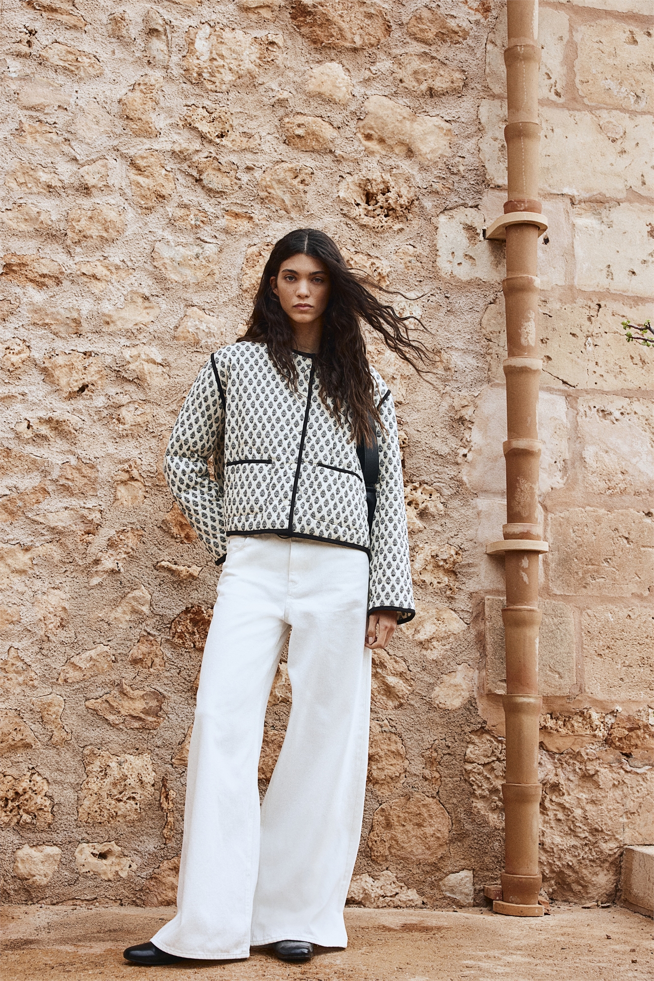 Куртка с легкой подкладкой из стеганого хлопкового полотна с круглым вырезом и застежками на кнопках спереди. Слегка спущенные плечи и накладные передние карманы. Хлопковая подкладка.