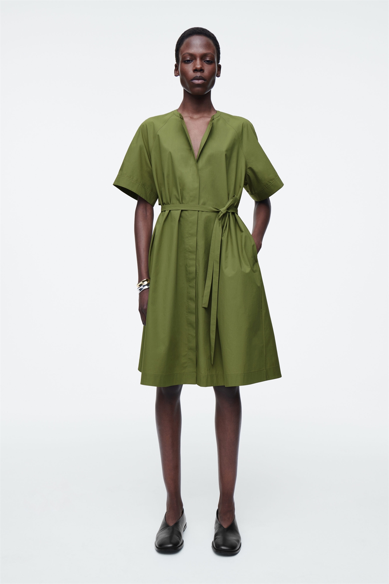 Это платье-миди выполнено в чистом, но изысканном силуэте - обратите внимание на воротник "дедушка", рукава реглан и объемный фасон A-line. Сшитое из мягкого хлопка-поплина, оно имеет накладку в стиле тренч сзади, незаметные карманы по бокам и пояс, чтобы смягчить непринужденный крой. Свободный крой Застежка на пуговицы Ткань: 100% хлопок. Без учета отделки / Машинная стирка Длина по спинке для размера EU 36 составляет 98 см / Модель носит размер EU 36