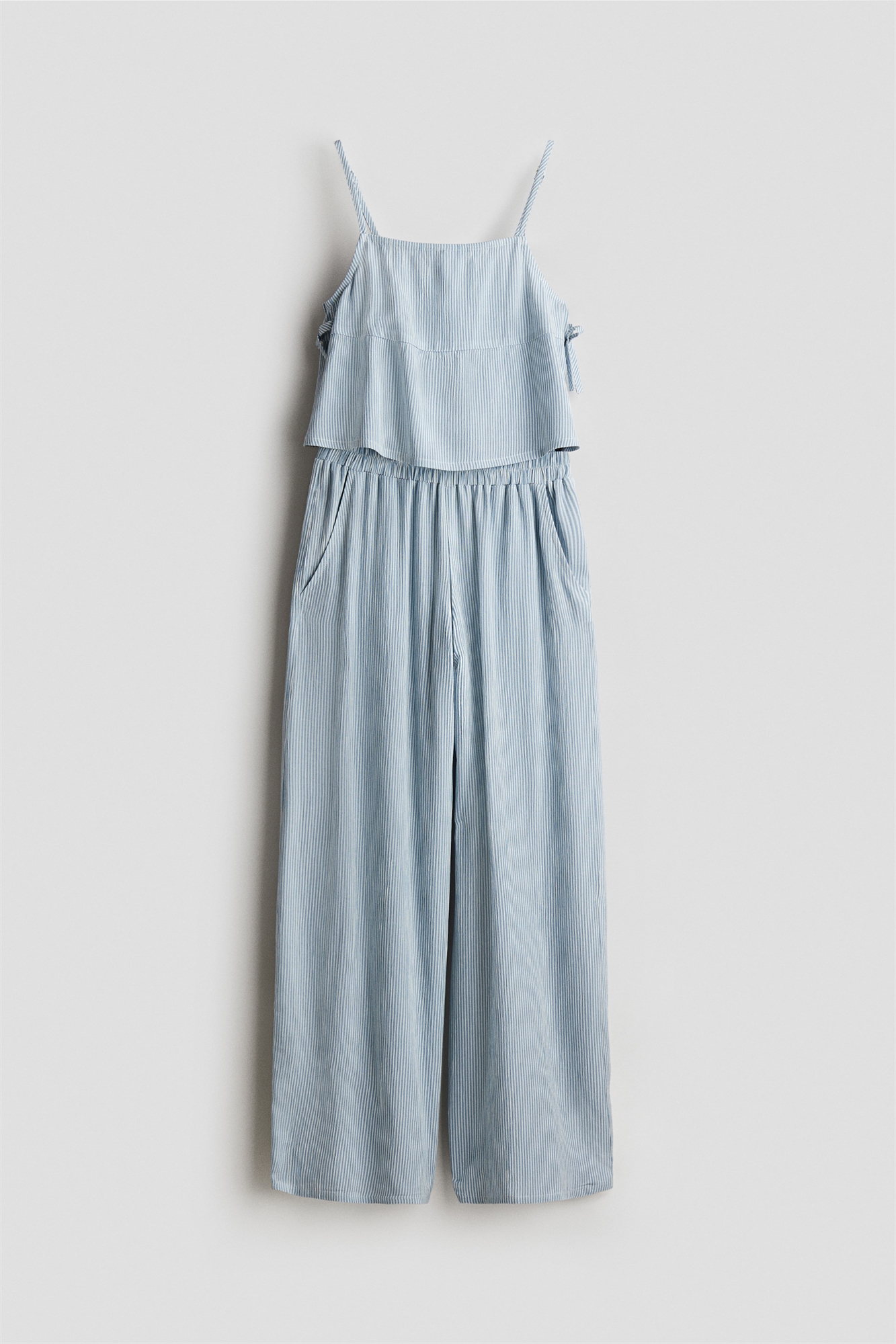 Комплект из топа на бретельках и брюк из мягкого трикотажа. Топ с квадратным вырезом, узкими регулируемыми бретелями, декоративной завязкой по бокам и расклешенным подолом. Брюки с эластичной талией, диагональными боковыми карманами и прямыми ногами.