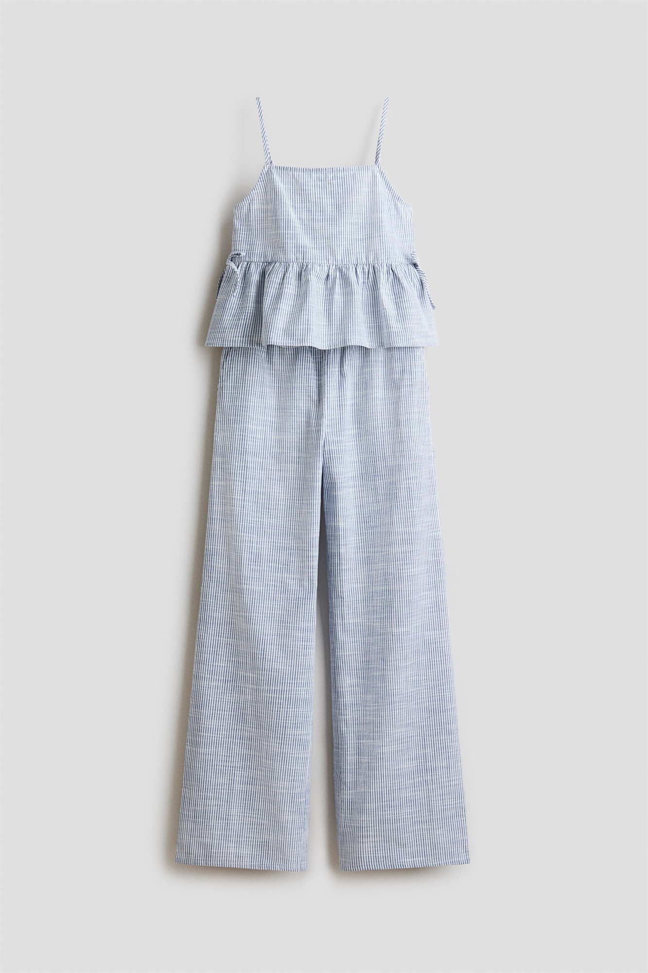 Комплект из топа на бретельках и брюк из мягкого трикотажа. Топ с квадратным вырезом, узкими регулируемыми бретелями, декоративной завязкой по бокам и расклешенным подолом. Брюки с эластичной талией, диагональными боковыми карманами и прямыми ногами.