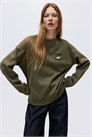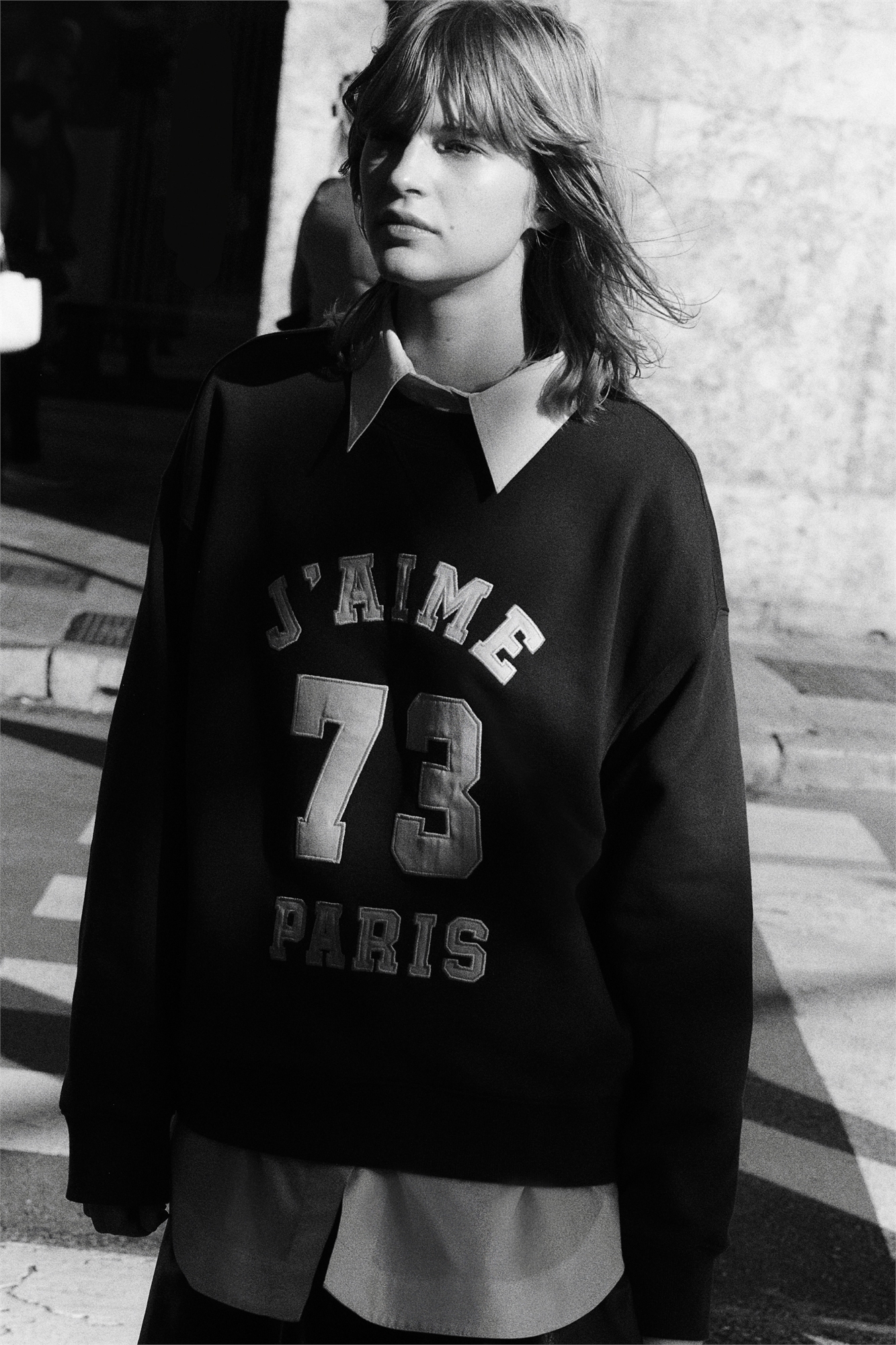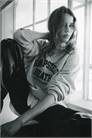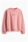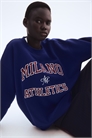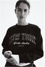 Топ оверсайз из толстовки с мягким начесом внутри и текстовым мотивом на груди. Спущенные плечи, длинные рукава и окантовка по вырезу горловины, манжетам и подолу.
