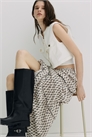 Юбка длиной до щиколоток из вискозного полотна с узкой эластичной резинкой на талии. Небольшая оверлочная отделка оборками по бедрам и над подолом. Подол с оверлоком. Частично на подкладке.