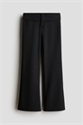 Брюки из мягкой эластичной саржи с заниженной талией, регулируемой резинкой, ширинкой на молнии и потайными застежками-крючками. Накладные карманы и расклешенные ноги.