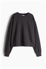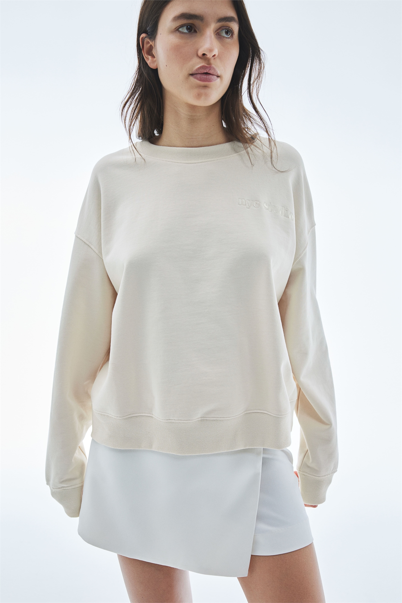 Топ оверсайз из легкой хлопковой ткани с вышитым текстовым мотивом на груди. Спущенные плечи, длинные рукава и окантовка по вырезу горловины, манжетам и подолу.