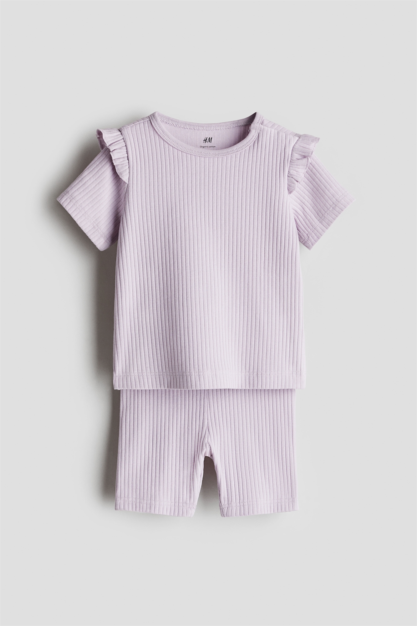 Комплект из топа и велосипедных шорт из мягкого ребристого хлопкового джерси. Топ с круглым вырезом с застежками на одной стороне (кроме размеров 2-4Y) и короткими рукавами. Велосипедные шорты с эластичной талией.