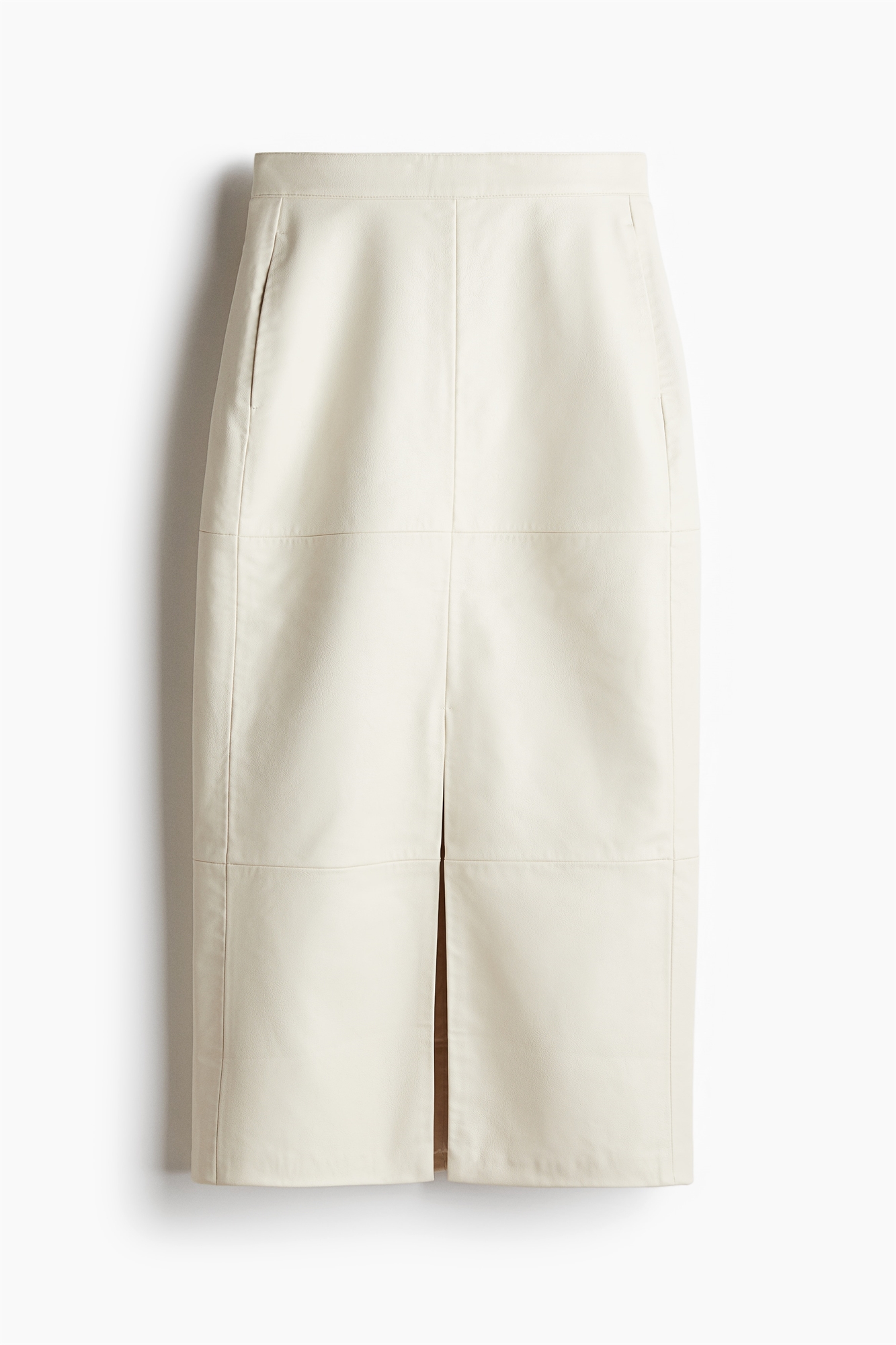Юбка длиной до колена из ткани с покрытием, с высокой талией, потайной застежкой-молнией и кнопкой с прессом сзади. Скрытые боковые карманы и высокий разрез спереди.