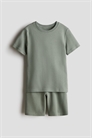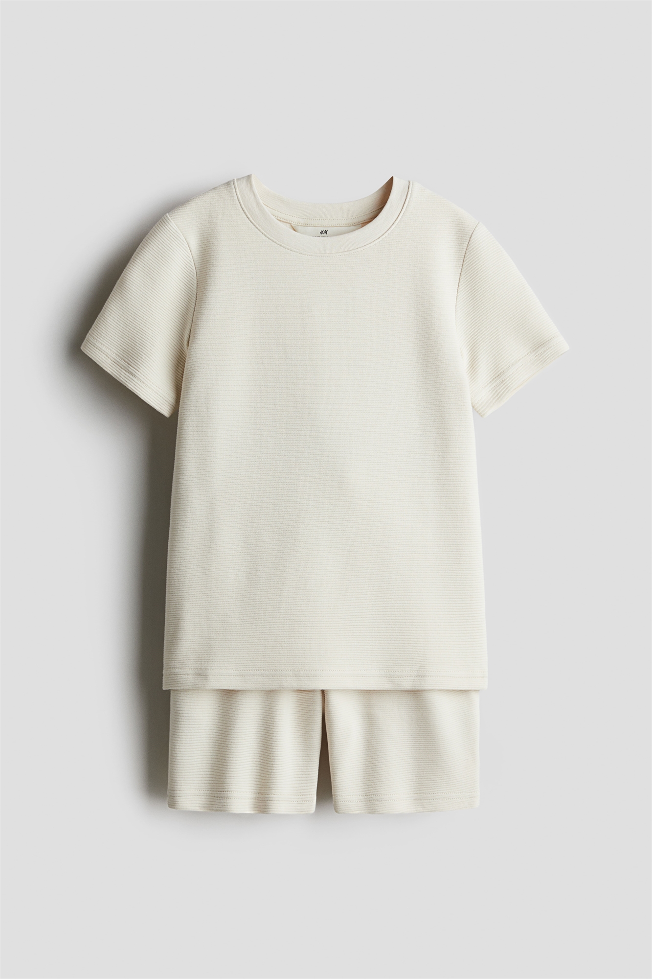 Комплект из футболки и шорт из ребристого плотного хлопкового джерси. Футболка с круглым вырезом. Шорты с эластичным утягивающим поясом и неброскими боковыми карманами.