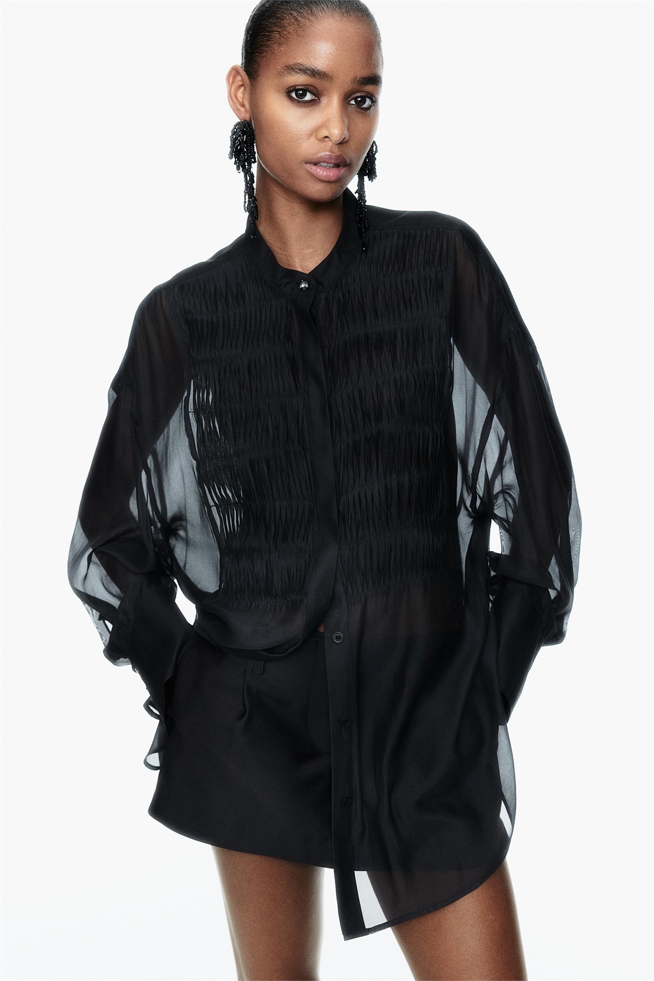 Рубашка большого размера из прозрачного шифона с воротником-бантом, потайными пуговицами спереди и нагрудником с узкими закрученными складками. Двухслойное ярмо с коробчатой складкой сзади. Спущенные плечи, длинные рукава и широкие манжеты с разрезом и гранеными пуговицами. Закругленный подол с разрезом с каждой стороны.
