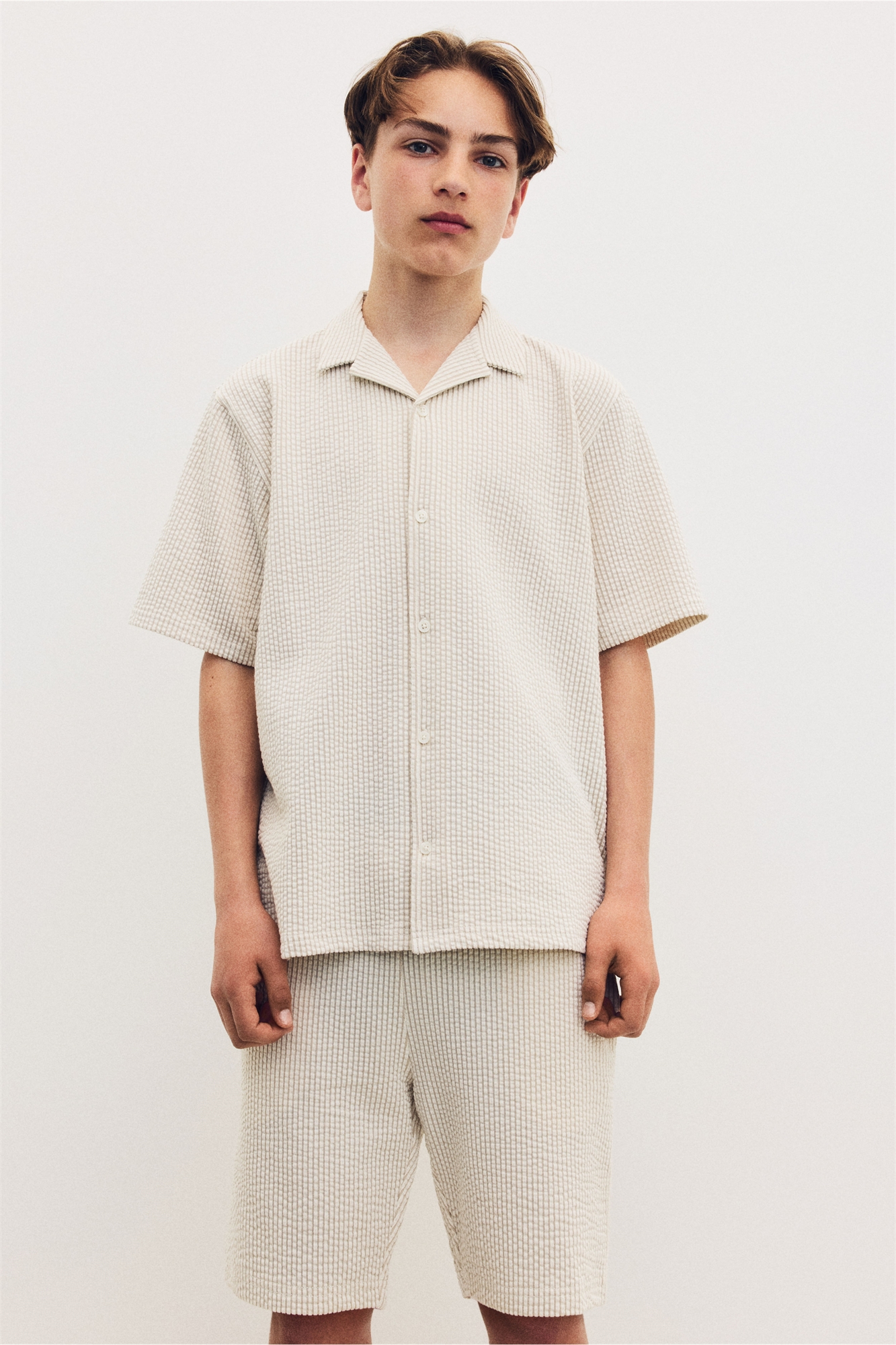 Комплект из курортной рубашки и шорт из мягкого трикотажа с рисунком под сардельки. Рубашка с короткими рукавами, курортным воротником, пуговицами спереди и спущенными плечами. Шорты с эластичной утягивающейся талией и неброскими боковыми карманами.