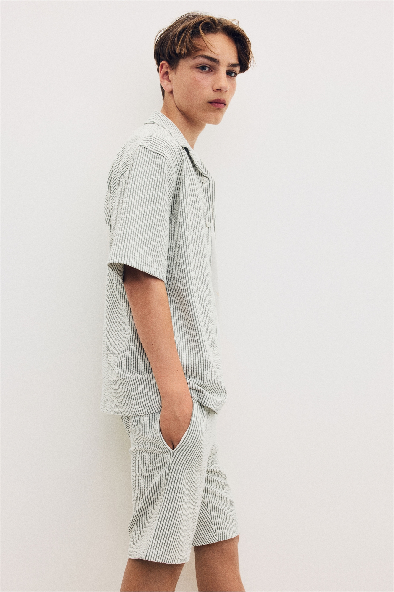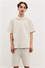 Комплект из курортной рубашки и шорт из мягкого трикотажа с рисунком под сардельки. Рубашка с короткими рукавами, курортным воротником, пуговицами спереди и спущенными плечами. Шорты с эластичной утягивающейся талией и неброскими боковыми карманами.