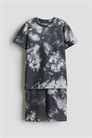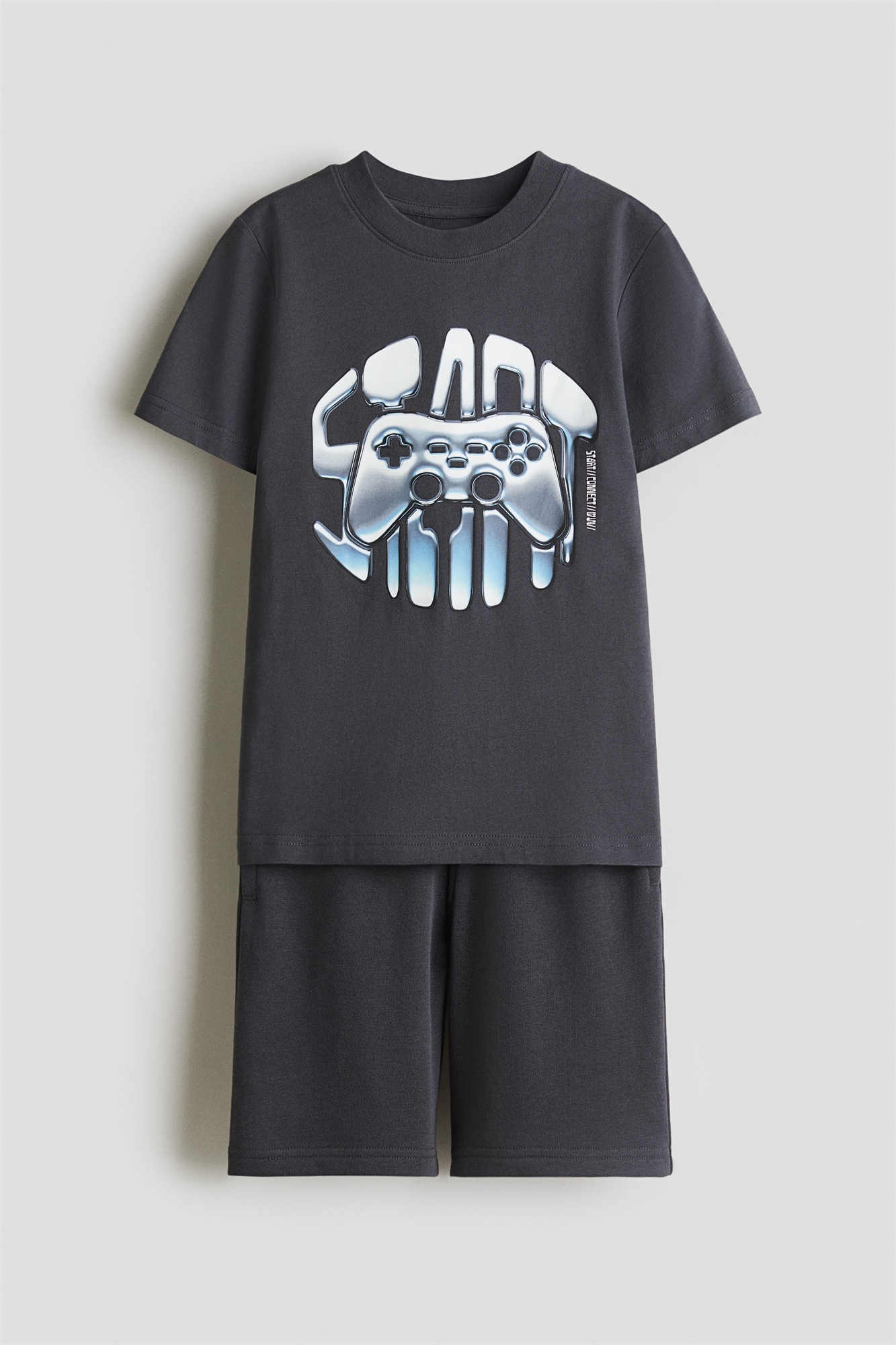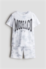 Комплект из футболки из мягкого хлопкового джерси и пары шорт из легкой толстовочной ткани. Футболка с круглым вырезом с ребристой отделкой и принтом спереди. Шорты с эластичным утягивающим поясом и неброскими боковыми карманами.