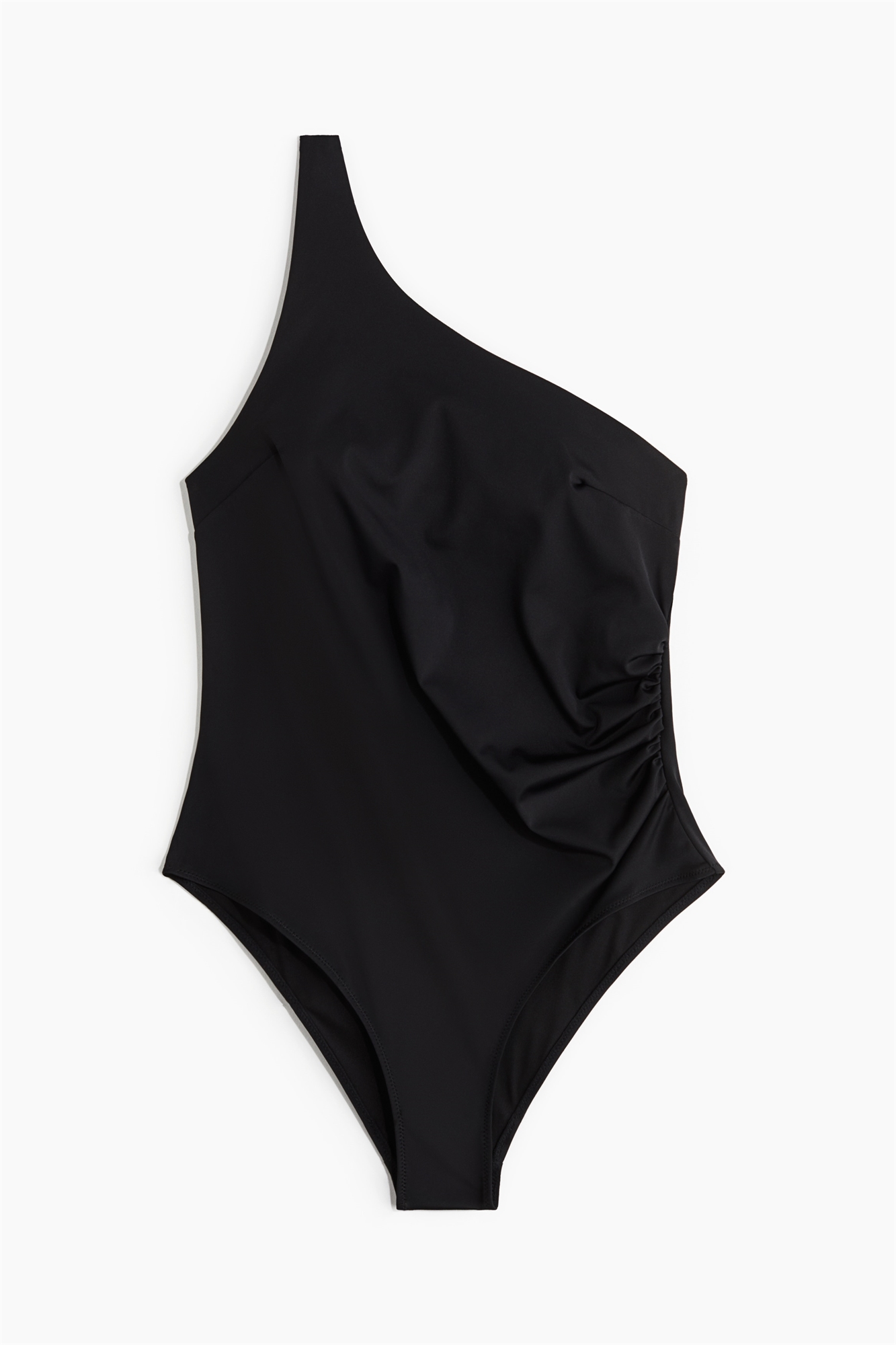 Полностью закрытый купальник на одно плечо с плотной посадкой, которая слегка корректирует талию. Асимметричный вырез с одной широкой бретелью и чашечками со съемными вкладышами, которые придают форму бюсту и обеспечивают хорошую поддержку. Сборки с одной стороны талии для легкой драпировки. Среднее покрытие сзади.