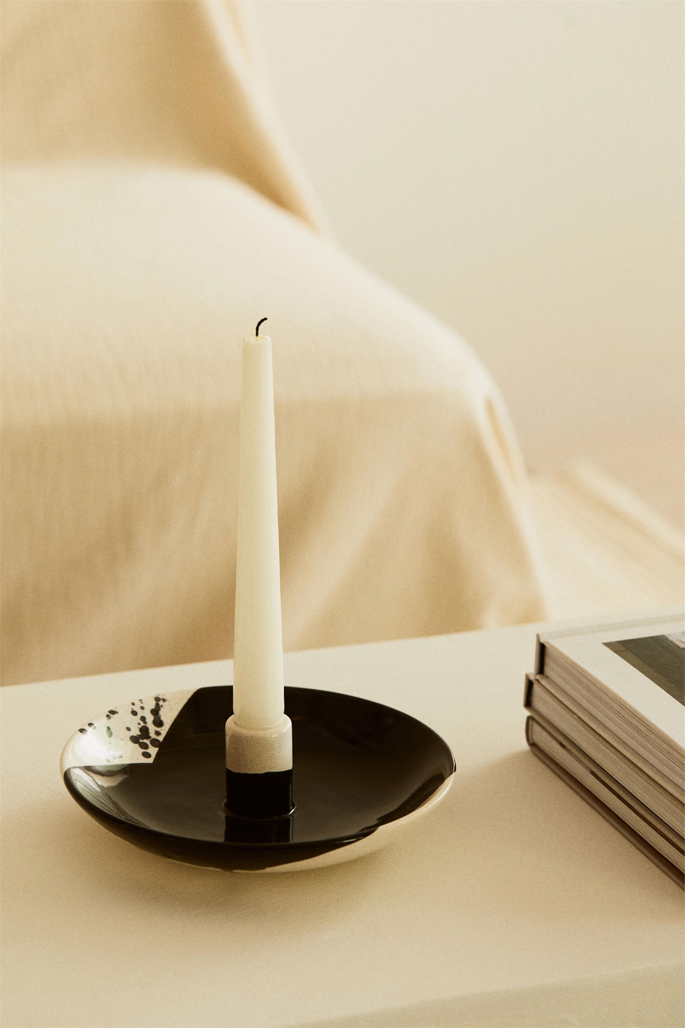 Классический подсвечник, выполненный из керамики с узором, нанесенным вручную, и глянцевым покрытием. Высота 5,5 см. Диаметр 19 см.