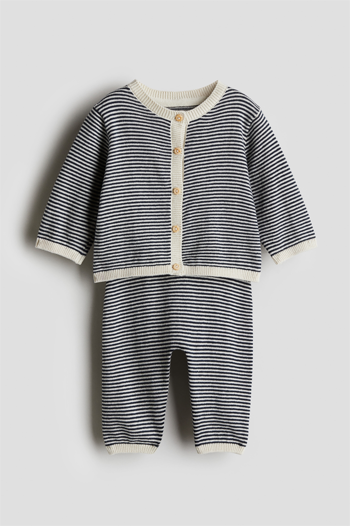Комплект из кардигана и брюк из мягкого хлопка тонкой вязки. Кардиган с круглым вырезом и пуговицами спереди. Брюки с эластичным поясом.