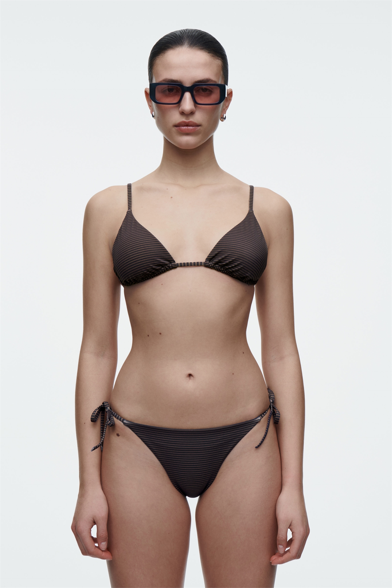 Эти трусы-бикини - нестареющий вариант для дней, проведенных на солнце. Украшенные темно-синими и шоколадно-коричневыми полосками, они имеют аккуратные завязки по бокам и обработаны мешковиной по швам. Это естественный выбор для поездки в отпуск: сочетайте их с соответствующим топом-бикини. Застежка на завязках Переработанный нейлон снижает потребность в ограниченных природных ресурсах и сокращает выбросы парниковых газов Материал: 80% переработанный полиамид (переработанный нейлон), 20% эластан. Без учета отделки / Ручная стирка
