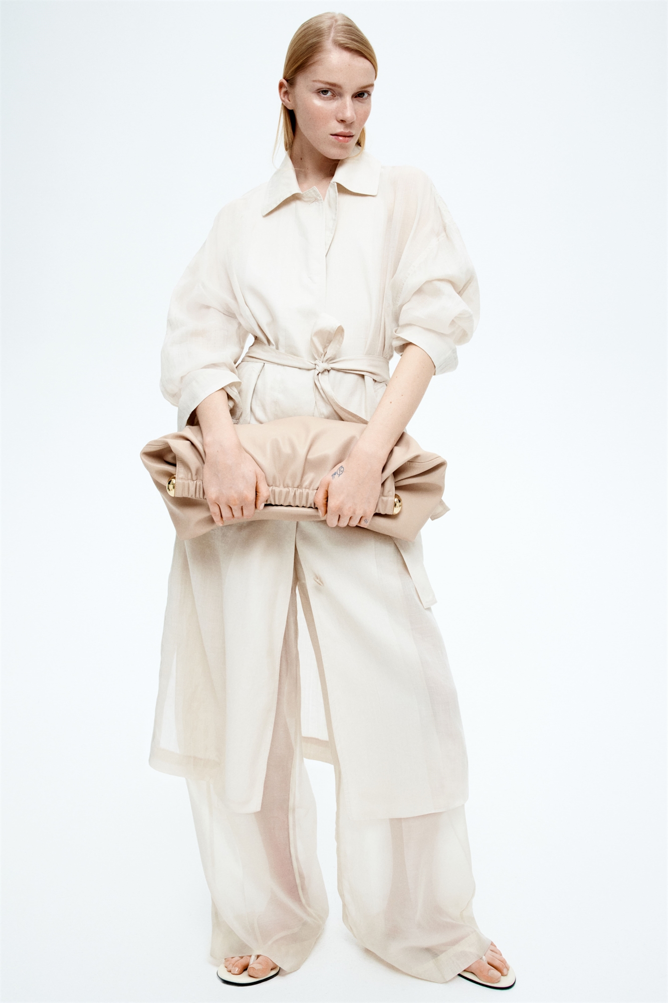 Длинный тренч из воздушной ткани рами с воротником, потайными пуговицами спереди и широким съемным поясом-завязкой на талии. Свободный крой с опущенными плечами и манжетами с регулируемой застежкой на пуговицы. Диагональные боковые карманы и накладной разрез с прорезью с каждой стороны. Без подкладки.
