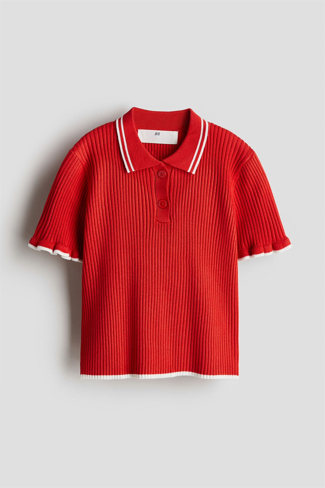 Топ из мягкого трикотажа в рубчик с воротником, застежкой на пуговицы и короткими рукавами с манжетами в рубчик.