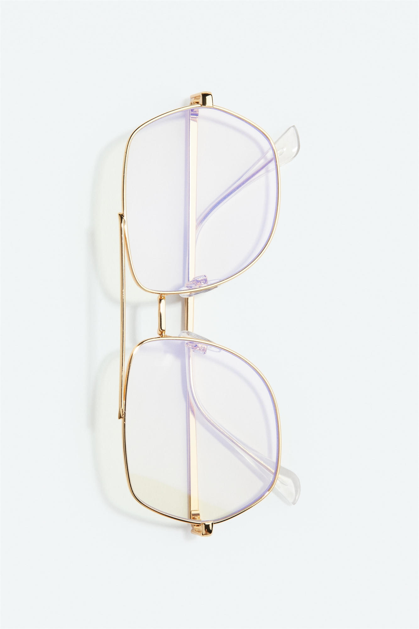 Очки в стиле "авиатор" с металлической оправой, регулируемыми носовыми дужками и прозрачными пластиковыми линзами. Линзы имеют специальное покрытие, отсеивающее синий свет от цифровых экранов.