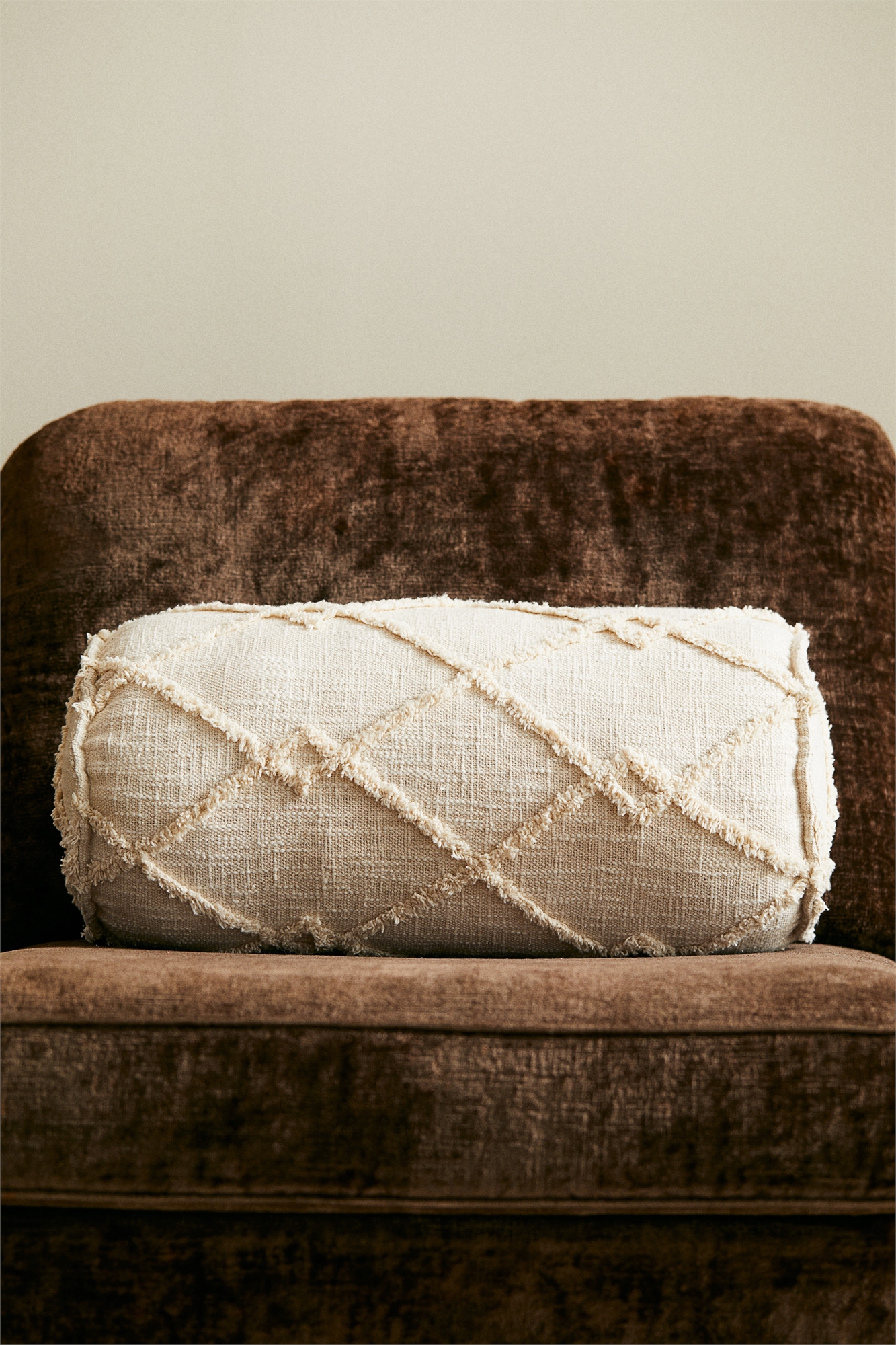 Болстер из хлопковой ткани с легкой структурой и ворсистым узором по всему периметру. Диаметр 18 см. Длина 45 см.