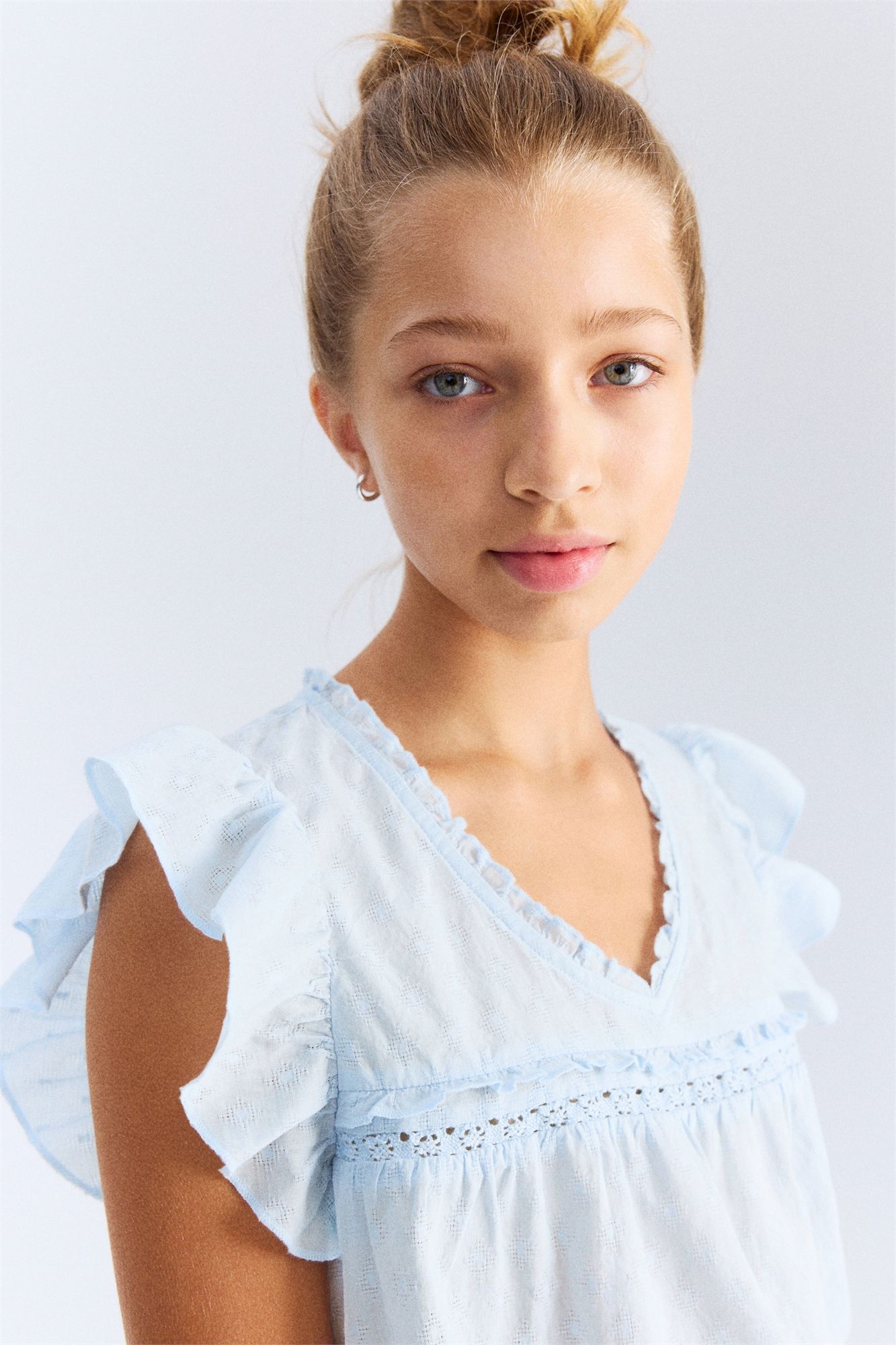 Блузка из воздушного хлопкового жаккарда с V-образным вырезом с оборками и рукавами-воланами. Отделка в виде оборок, кружевная лента и сборчатый шов спереди.