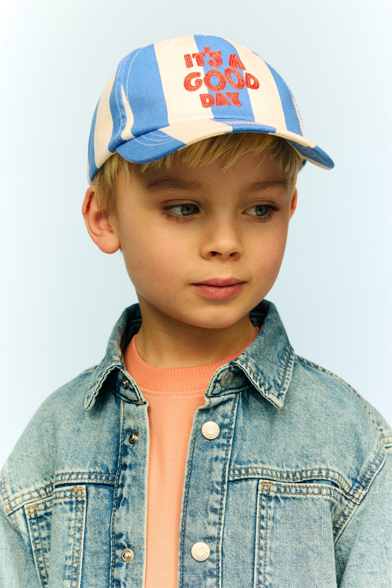 Кепка из хлопковой саржи с вышитым мотивом спереди, вышитыми люверсами и регулируемым язычком с металлической застежкой сзади.