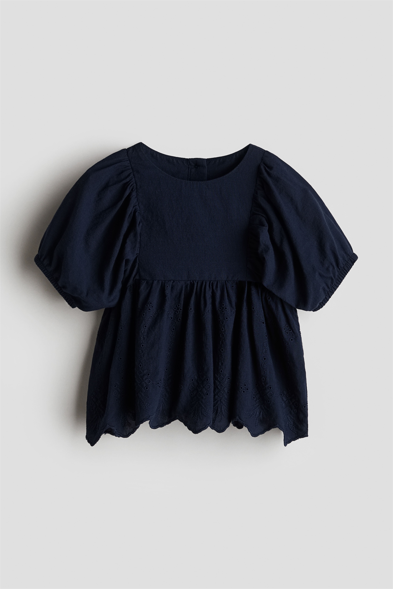 Блузка из мягкого хлопкового полотна с пеплумом, украшенным бродери-англиз. Круглый вырез, застежка на пуговицы сзади и объемные пышные рукава с узкой резинкой на манжетах. Сборки на талии и обрезки по подолу. Частично на подкладке.