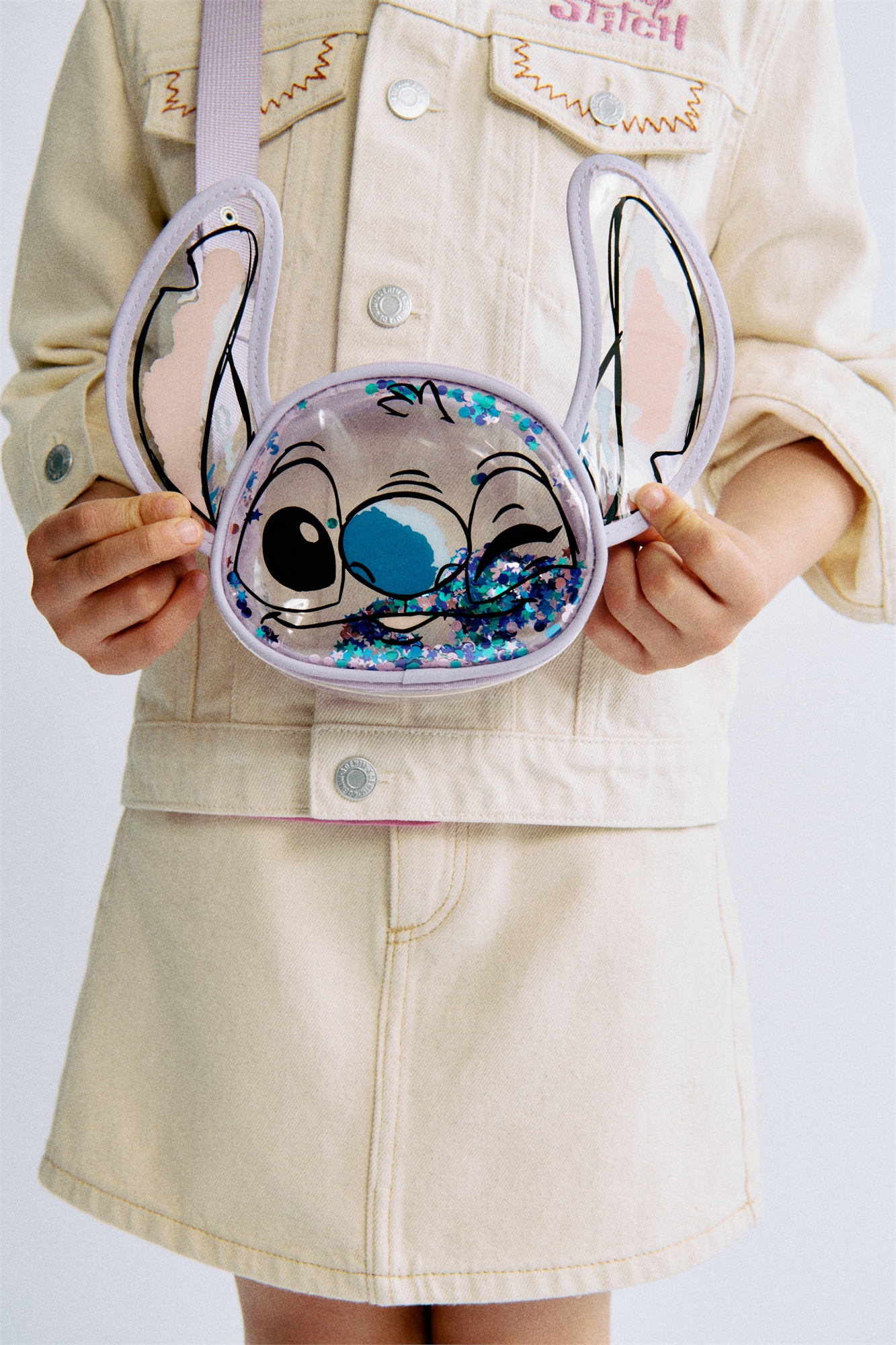 Сумка-кроссбоди из двухслойного прозрачного пластика с принтом, аппликацией и блестками в форме звезд спереди. Застежка-молния сверху и плечевой ремень с отстегивающейся кнопкой на одном конце.