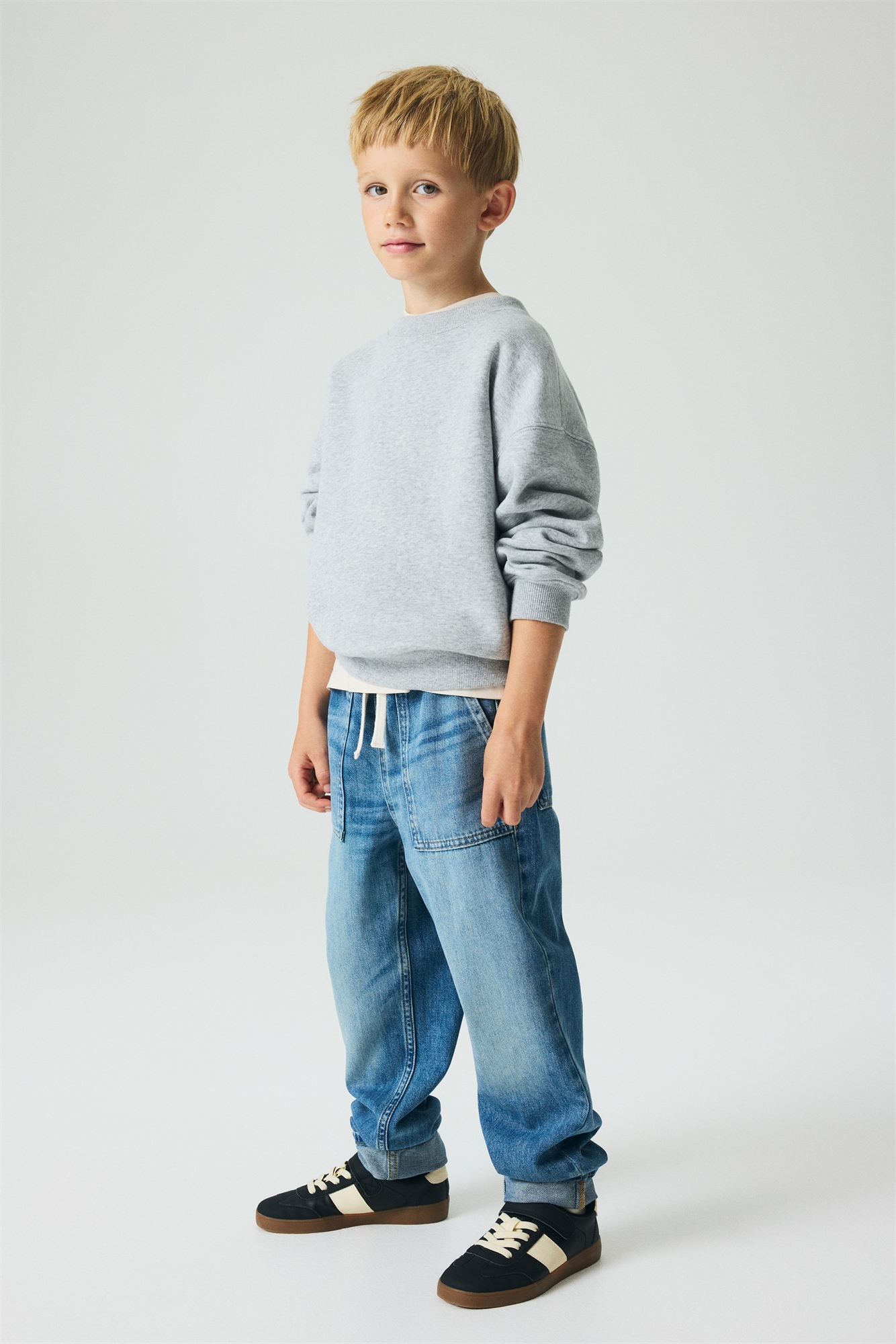 Брюки из мягкого хлопкового денима с эластичным утягивающим поясом. Накладные карманы спереди и сзади и зауженные ноги.