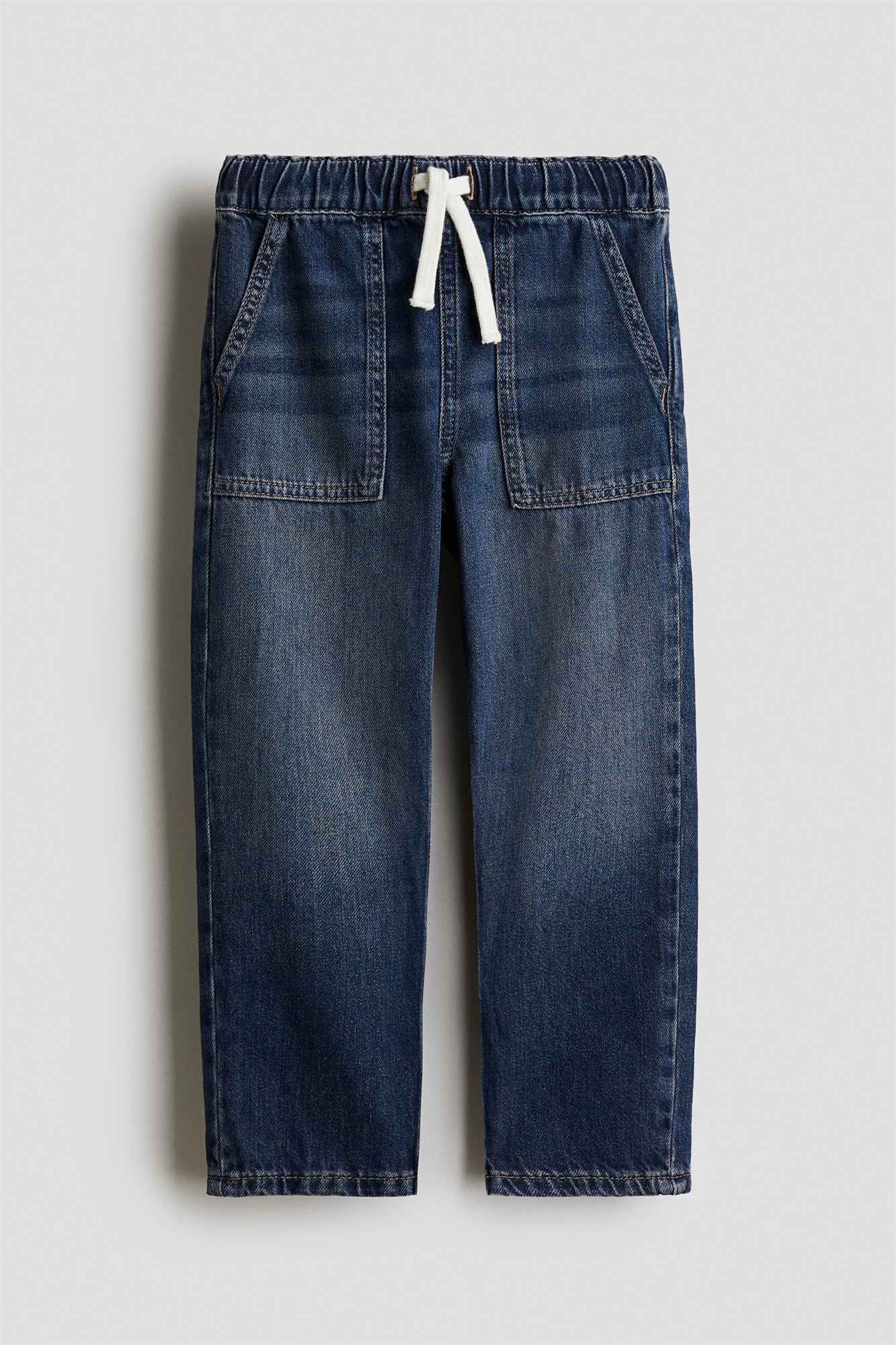 Брюки из мягкого хлопкового денима с эластичным утягивающим поясом. Накладные карманы спереди и сзади и зауженные ноги.