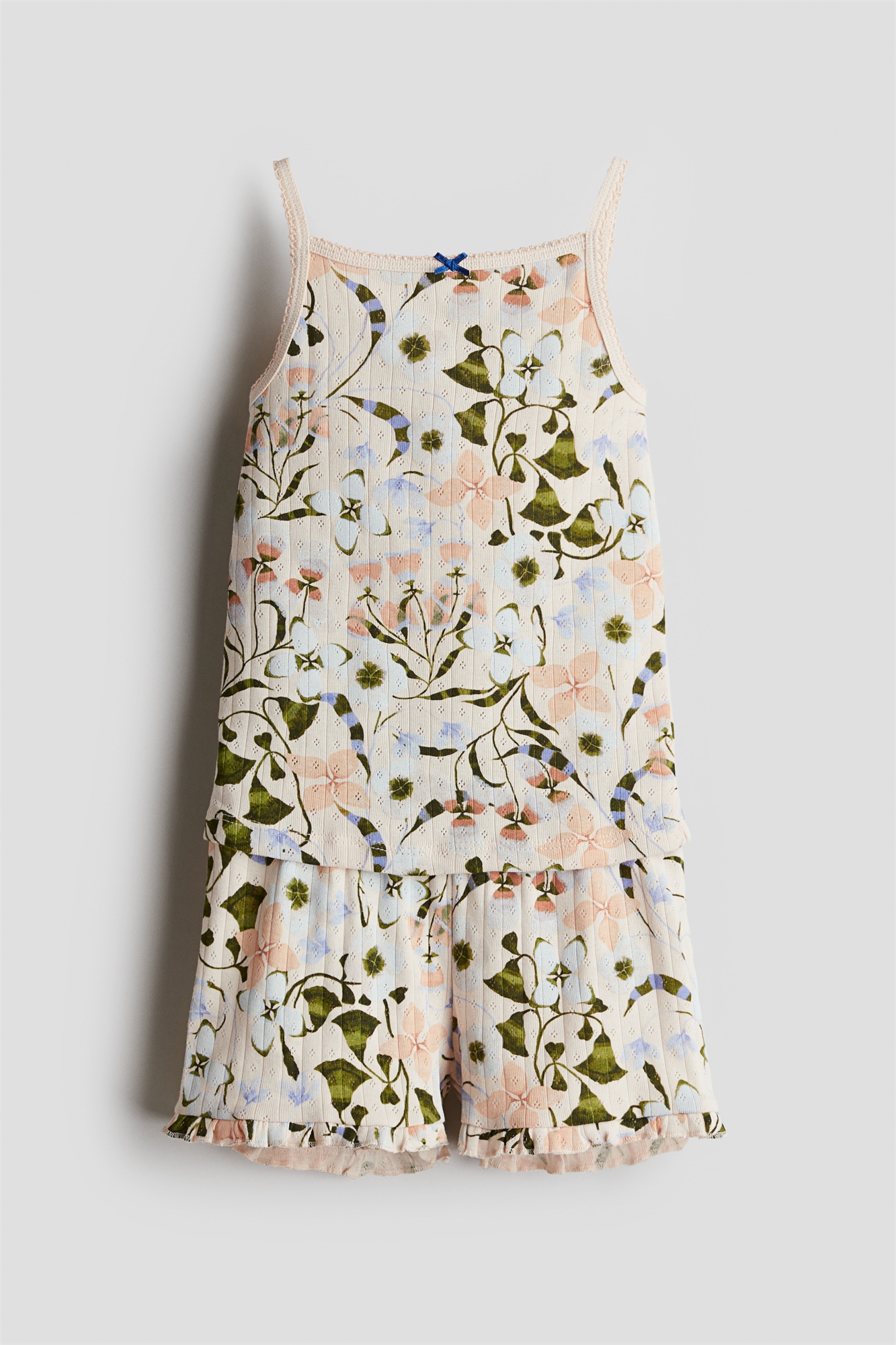 H&M x Georgia Beaumont. Пижама из мягкого хлопкового пуантельевого трикотажа с принтом на всю длину. Топ на бретелях с квадратным вырезом, маленьким атласным бантиком спереди и отделкой пико в верхней части. Шорты с эластичной резинкой на талии и отделкой оборкой по краю.