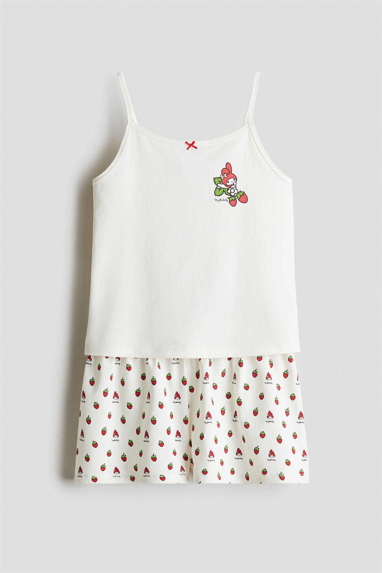 Пижама с топом на бретелях и шортами из мягкого хлопкового джерси. Топ с принтом спереди. Круглый вырез, украшенный маленьким атласным бантиком, и узкие бретели. Шорты с эластичной талией.